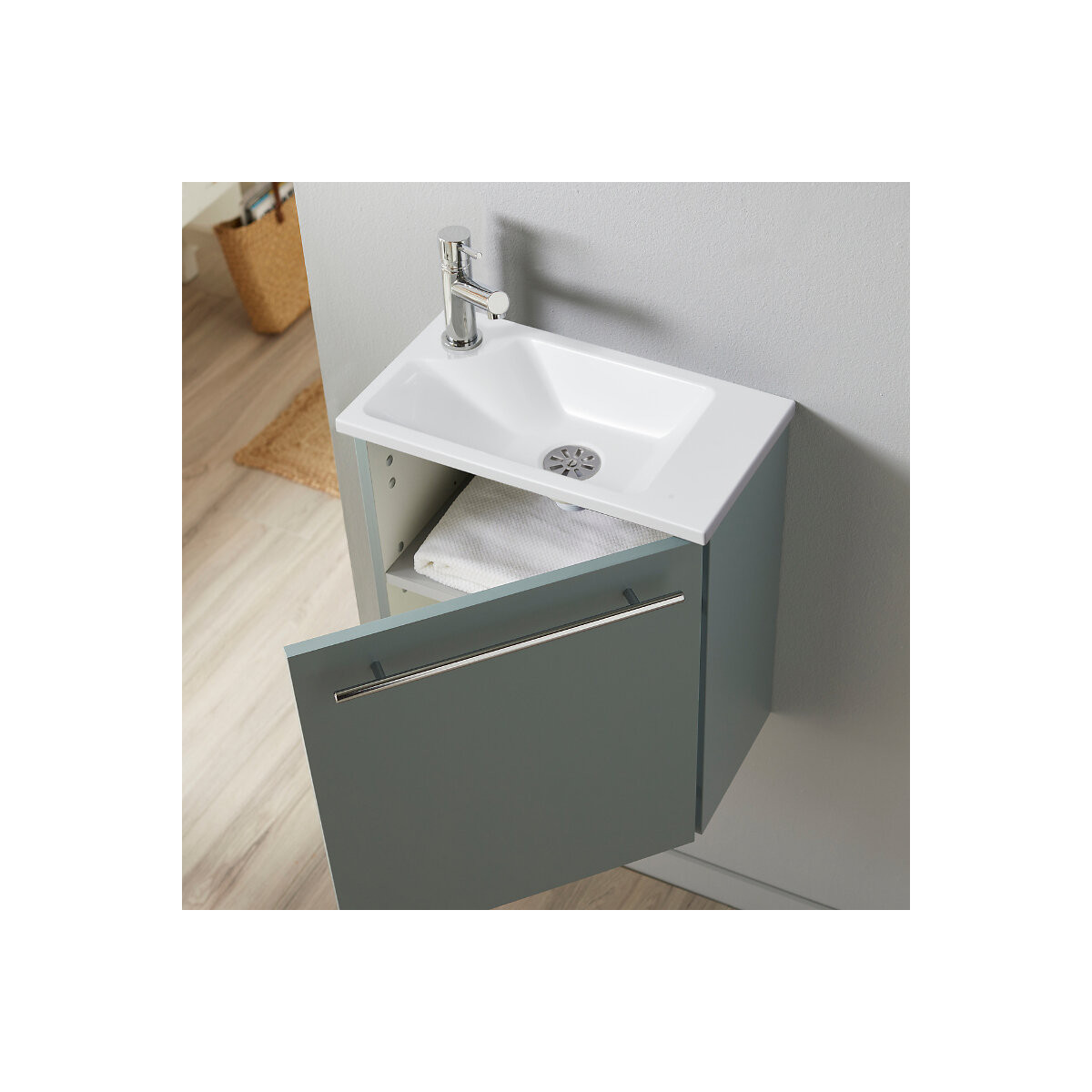 Cet ensemble meuble lave-mains suspendu Hamac couleur Vert de gris contient : Un meuble couleur vert de gris + un lave-mains en Solid stone blanc + une robinetterie eau froide + une bonde + un siphon + un kit de fixation murale. CARACTÉRISTIQUES TECHNIQUES MEUBLE : Meuble en mélaminé finition mate 'Vert de gris'. Ce meuble est équipé d'un niveau de tablette. La porte réversible est équipée d'une poignée faisant office de porte serviette. Épaisseur du caisson et de la porte 16mm. Meuble monté en usine. Dimensions du meuble : L 42.5 x H 47 x P 23.5 cm. Conseil : Ne fixer la poignée que lorsque vous aurez choisi le sens d'ouverture de la porte. LAVE-MAINS : Lave-mains en Solid Stone blanc. Lave-mains non réversible. Dimensions du lave-mains : L 42.5 X H 1.6 X P 23.5 cm. ROBINETTERIE : Robinet eau froide. Flexible non inclus.(Raccord mâle 15/21 ou 1/2') Robinet placé à GAUCHE non réversible. VIDAGE : La bonde à écoulement libre et le siphon sont inclus. Fabrication Européenne. PRÉCAUTIONS D'INSTALLATION : La poignée est à monter soi même. Les trous de pré perçage à l 'arrière de la porte sont prévus pour l 'installation de la poignée uniquement à l 'horizontale. Ne fixer la poignée que lorsque vous aurez choisi le sens d'ouverture de la porte. Les meubles doivent être fixés au mur. Utilisez les matériaux de fixation en fonction de vos murs (chevilles et visseries).
