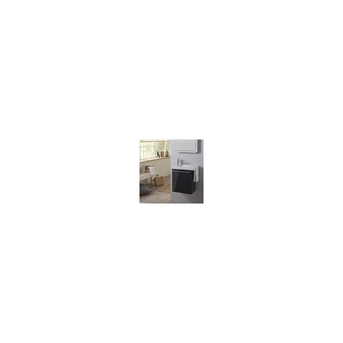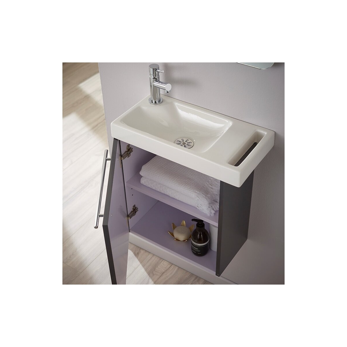 Ce pack lave-mains est composé d'un meuble lave-mains, d'un lave-mains, d'un robinet eau froide, d'une bonde et d'un siphon. Meuble : Ce meuble est en matière mdf de couleur gris anthracite. Il est équipé d'un niveau de tablette. Cette tablette vous permettra de ranger vos produits d'entretien ou votre papier toilette. La porte du meuble est réversible et est munie d'une poignée à placer à l 'horizontale. Lave-Mains : Le lave-mains est en céramique blanc. Ce lave-mains est équipé d'un porte-serviette et d'une plage de dépose. Ce lave-mains est non réversible. Robinetterie : Ce pack lave mains est équipé d'une robinetterie eau froide uniquement. La robinetterie est placée à gauche et elle est non réversible.flexible non fourni Ce meuble est livré monté. Conseils: Ne fixez la poignée que lorsque vous aurez choisi le sens d'ouverture de la porte !