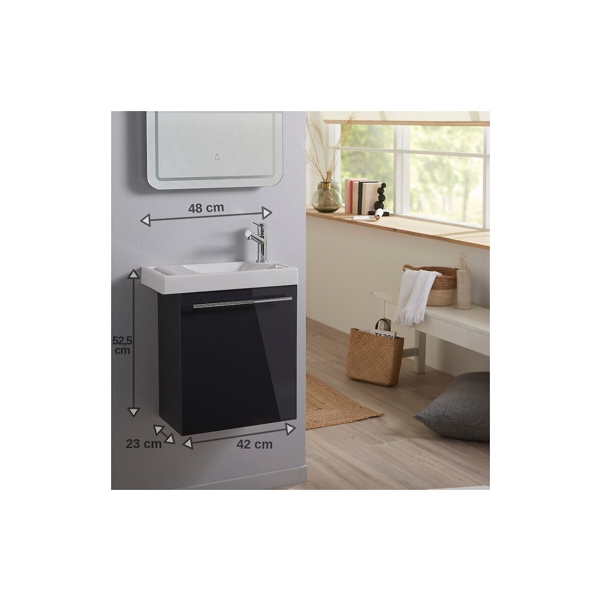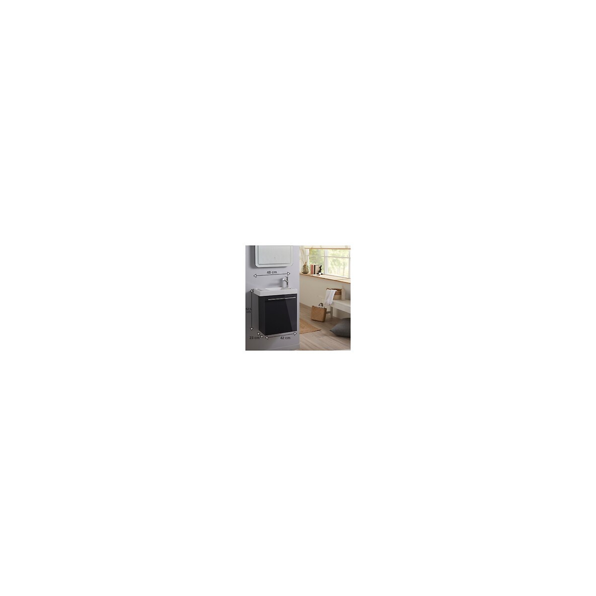 Cet ensemble meuble lave-mains suspendu Hamac couleur Anthracite contient : un meuble + un lave-mains en céramique porte serviette + une robinetterie eau froide + une bonde + un siphon + un kit de fixation murale CARACTÉRISTIQUES TECHNIQUES MEUBLE : Meuble en mélaminé laqué 'Anthracite'. Ce meuble est équipé d'un niveau de tablette. La porte réversible est équipée d'une poignée faisant office de porte serviette. Épaisseur du caisson et de la porte 16mm. Meuble monté en usine. Dimensions du meuble : L42.5xH47xP23.5 cm. Conseil : Ne fixer la poignée que lorsque vous aurez choisi le sens d'ouverture de la porte. LAVE-MAINS : Lave-mains en céramique blanc. Ce lave mains est équipé d'un porte serviette et d'une plage de dépose. Lave-mains non réversible. ROBINETTERIE : Robinet eau froide. Flexibles non inclus. Robinet placé à DROITE non réversible. VIDAGE : La bonde à écoulement libre et le siphon sont inclus. PRÉCAUTIONS D'INSTALLATION : La poignée est à monter soi même. Les trous de pré perçage à l 'arrière de la porte sont prévus pour l 'installation de la poignée uniquement à l 'horizontale. Ne fixer la poignée que lorsque vous aurez choisi le sens d'ouverture de la porte Les meubles doivent être fixés au mur. Utilisez les matériaux de fixation en fonction de vos murs (chevilles et visseries).