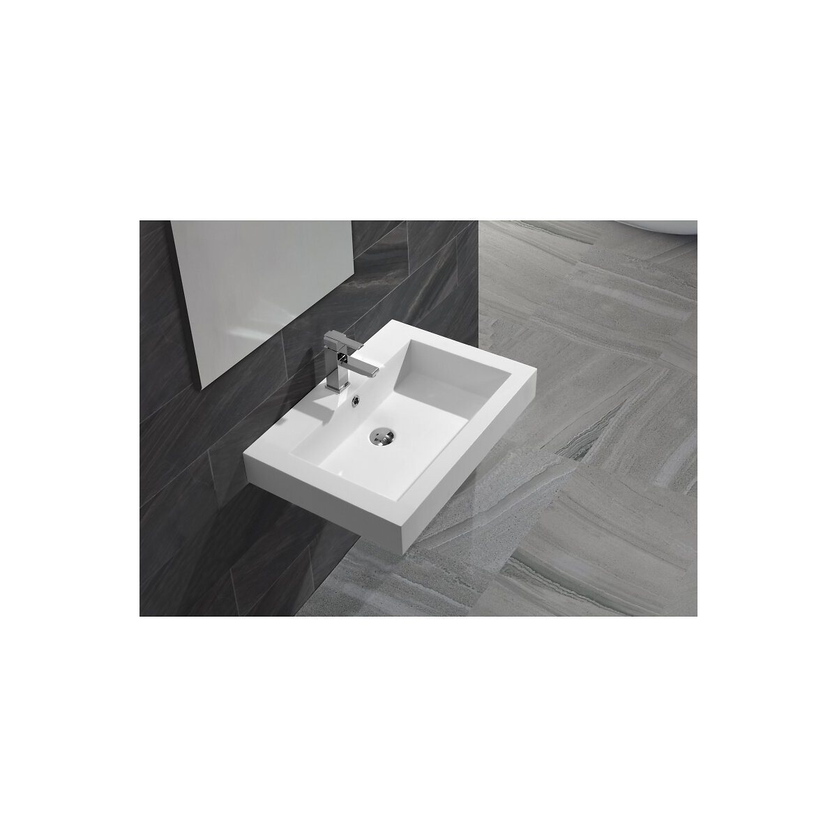 Vasque semi encastrée ou à suspendre en Solid Surface avec trop plein . Cette vasque pourra être fixé à un mur. Elle s'imposera comme le meuble élégant de votre salle de bain. Sa modernité et son ergonomie sont ses points forts. Elle n'est large que de 58 cm. Elle pourra être posé aussi sur un plan de travail. Il faudra prévoir un trou d'encastrement de la largeur de la vasque. CARACTÉRISTIQUES TECHNIQUES Dimensions : L58 x L48 x H15 cm. Poids : 16.5 Kg. Couleur : Blanc finition mate. Forme : Rectangulaire Pose : Semi-Encastrée ou à suspendre. Matière : Solid surface (résine minérale) - Forte résistance à l 'usure et aux chocs. Plage de robinetterie : Oui. Trop plein : Oui. Kit de fixation : Non Inclus. Livrée sans robinetterie, sans siphon et sans bonde. Le Solid surface est constitué de pierre de synthèse dont la grande solidité est proche de celle du granit. C'est un matériau haute résistance, non poreux qui se nettoie très facilement avec un chiffon et un produit d'entretien non corrosif. Utilisation de vinaigre blanc ou citron conseillé.