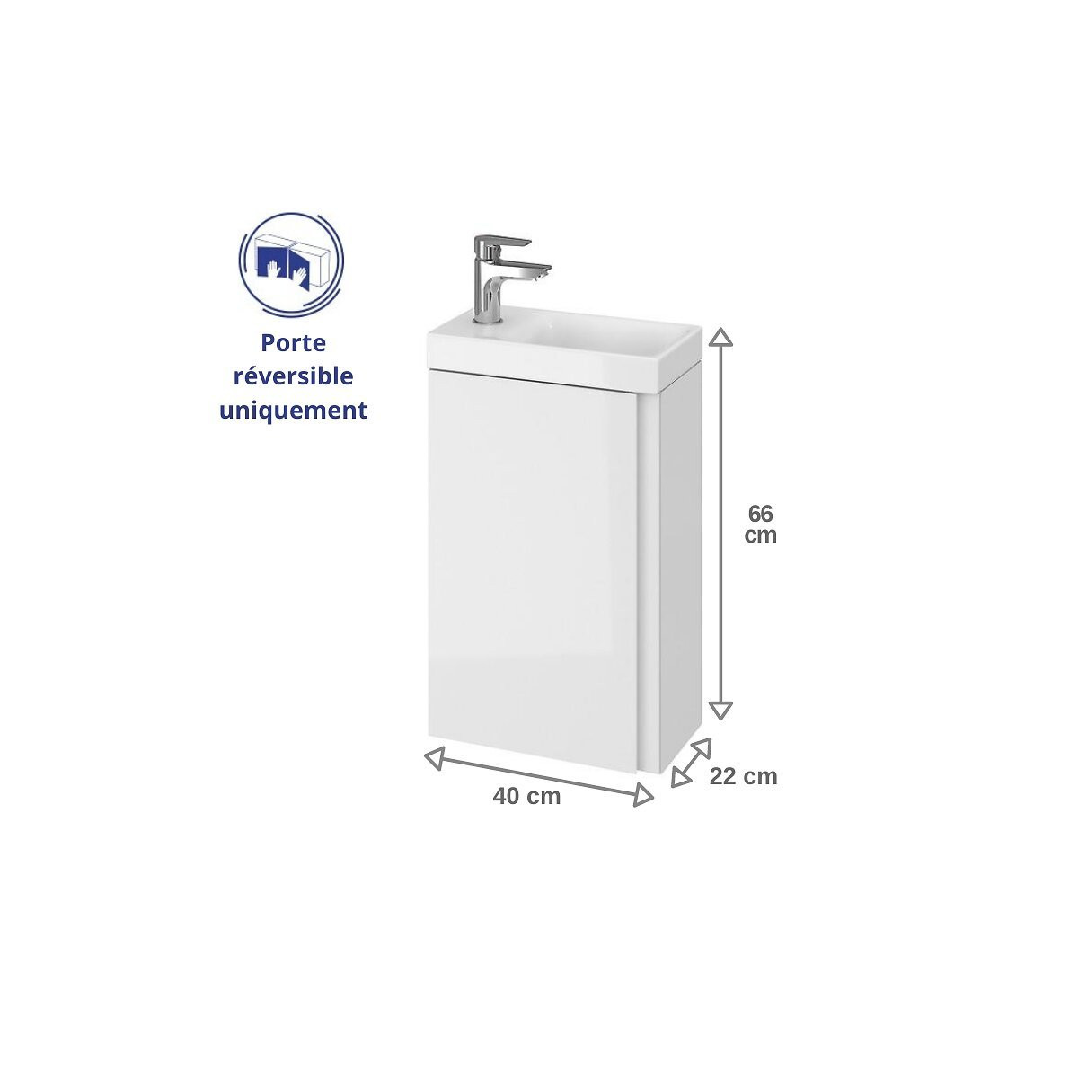 Cet ensemble meuble lave-mains faible profondeur, de 22 cm seulement, est composé d'un meuble d'une largeur de 40 cm et un lave-mains en céramique. MEUBLE : - Meuble et Façade en MDF. - Finition du caisson et façade en blanc brillant. - Fermeture soft close. - Couleur : blanc. - Meuble à suspendre. - Meuble en kit. - Dimensions : L39 x H59 x P21.5 cm. - Le meuble peut être montée en version gauche ou droite en modifiant l'emplacement des charnières. Cette caractéristique garantit des possibilités d'agencement de salle de bain illimitées. + Produit du meuble : Faible encombrement. Facilité de nettoyage. LAVE-MAINS : - Lave-mains en céramique de qualité. - Plage de robinetterie à gauche et trop plein intégré. - Couleur : Blanc. - Robinetterie et système de vidage non fournis. - Bonde avec trop plein obligatoire. - Dimensions : L40 x H7 x P22 cm. + Produit de la porcelaine: Très résistante aux rayures et a une utilisation très régulière, sans perdre sa brillance. Haute résistance aux produits d'entretiens corrosifs. Information importante : Seul la partie meuble est réversible, le lave-mains est obligatoirement avec robinetterie à gauche. L'ensemble sera expédié en deux colis.