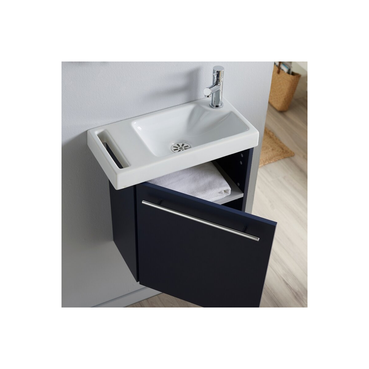 Cet ensemble meuble lave-mains suspendu Hamac couleur Bleu nuit contient : Un meuble couleur Bleu nuit + un lave-mains en céramique porte serviette + une robinetterie eau froide + une bonde + un siphon + un kit de fixation murale CARACTÉRISTIQUES TECHNIQUES : MEUBLE : Meuble en mélaminé finition mate 'Bleu nuit'. Ce meuble est équipé d'un niveau de tablette. La porte réversible est équipée d'une poignée faisant office de porte serviette. Épaisseur du caisson et de la porte 16mm. Meuble monté en usine. Dimensions du meuble : L42.5xH47xP23.5 cm. Conseil : Ne fixer la poignée que lorsque vous aurez choisi le sens d'ouverture de la porte. LAVE-MAINS : Lave-mains en céramique blanc. Ce lave mains est équipé d'un porte serviette et d'une plage de dépose. Lave-mains non réversible. ROBINETTERIE : Robinet eau froide. Flexible non inclus. Robinet placé à DROITE non réversible. VIDAGE : La bonde à écoulement libre et le siphon sont inclus. PRÉCAUTIONS D'INSTALLATION : La poignée est à monter soi même. Les trous de pré perçage à l 'arrière de la porte sont prévus pour l 'installation de la poignée uniquement à l 'horizontale. Ne fixer la poignée que lorsque vous aurez choisi le sens d'ouverture de la porte Les meubles doivent être fixés au mur. Utilisez les matériaux de fixation en fonction de vos murs (chevilles et visseries).