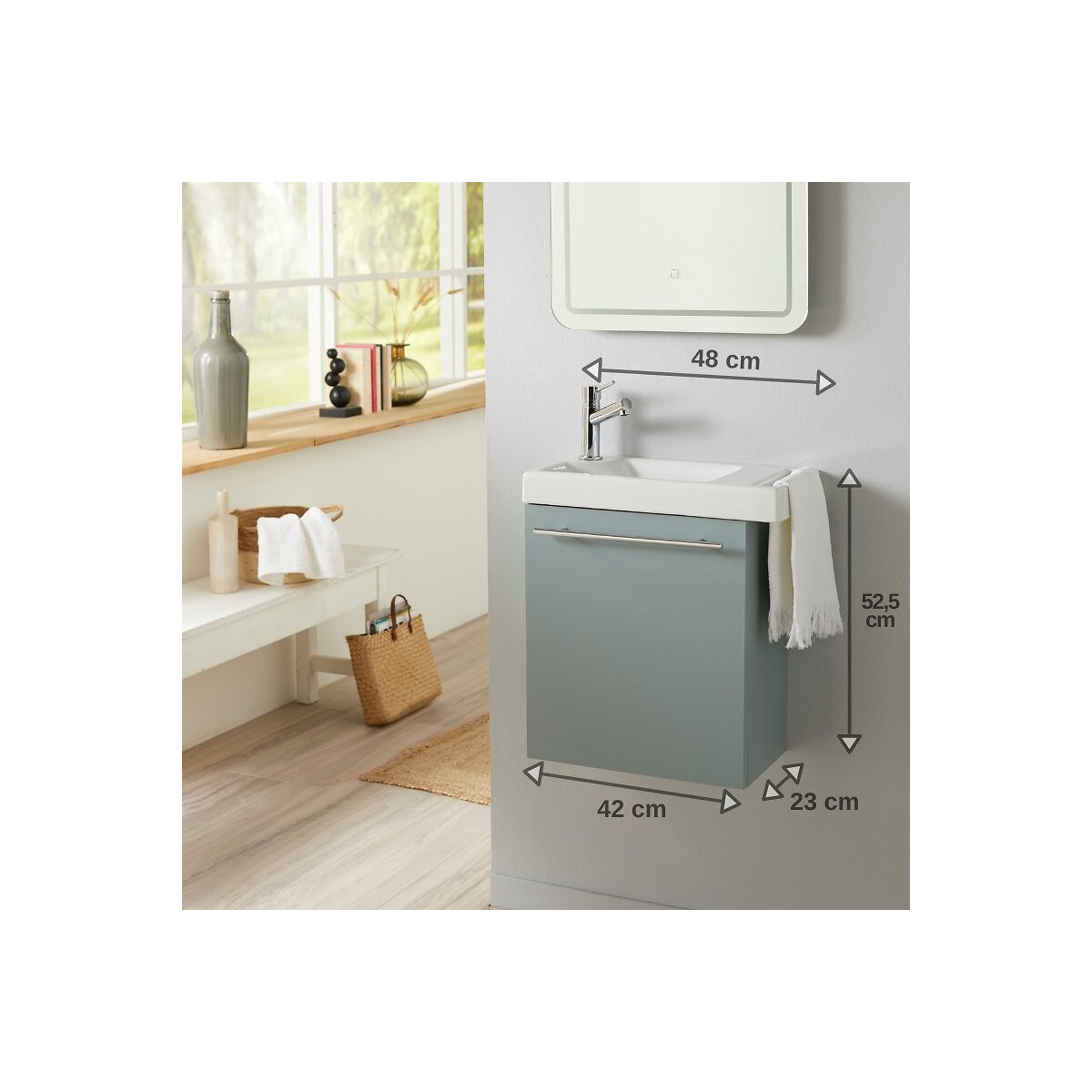 Cet ensemble meuble lave-mains suspendu Hamac couleur Vert de gris contient : un meuble couleur Vert de gris + un lave-mains en céramique porte serviette + une robinetterie eau froide + une bonde + un siphon + un kit de fixation murale CARACTÉRISTIQUES TECHNIQUES : MEUBLE : Meuble en mélaminé finition mate 'Vert de gris'. Ce meuble est équipé d'un niveau de tablette. La porte réversible est équipée d'une poignée faisant office de porte serviette. Épaisseur du caisson et de la porte 16mm. Meuble monté en usine. Dimensions du meuble : L42.5xH47xP23.5 cm. Conseil : Ne fixer la poignée que lorsque vous aurez choisi le sens d'ouverture de la porte. LAVE-MAINS : Lave-mains en céramique blanc. Ce lave mains est équipé d'un porte serviette et d'une plage de dépose. Lave-mains non réversible. ROBINETTERIE : Robinet eau froide. Flexibles non inclus. Robinet placé à GAUCHE non réversible. VIDAGE : La bonde à écoulement libre et le siphon sont inclus. PRÉCAUTIONS D'INSTALLATION : La poignée est à monter soi même. Les trous de pré perçage à l 'arrière de la porte sont prévus pour l 'installation de la poignée uniquement à l 'horizontale. Ne fixer la poignée que lorsque vous aurez choisi le sens d'ouverture de la porte Les meubles doivent être fixés au mur. Utilisez les matériaux de fixation en fonction de vos murs (chevilles et visseries).