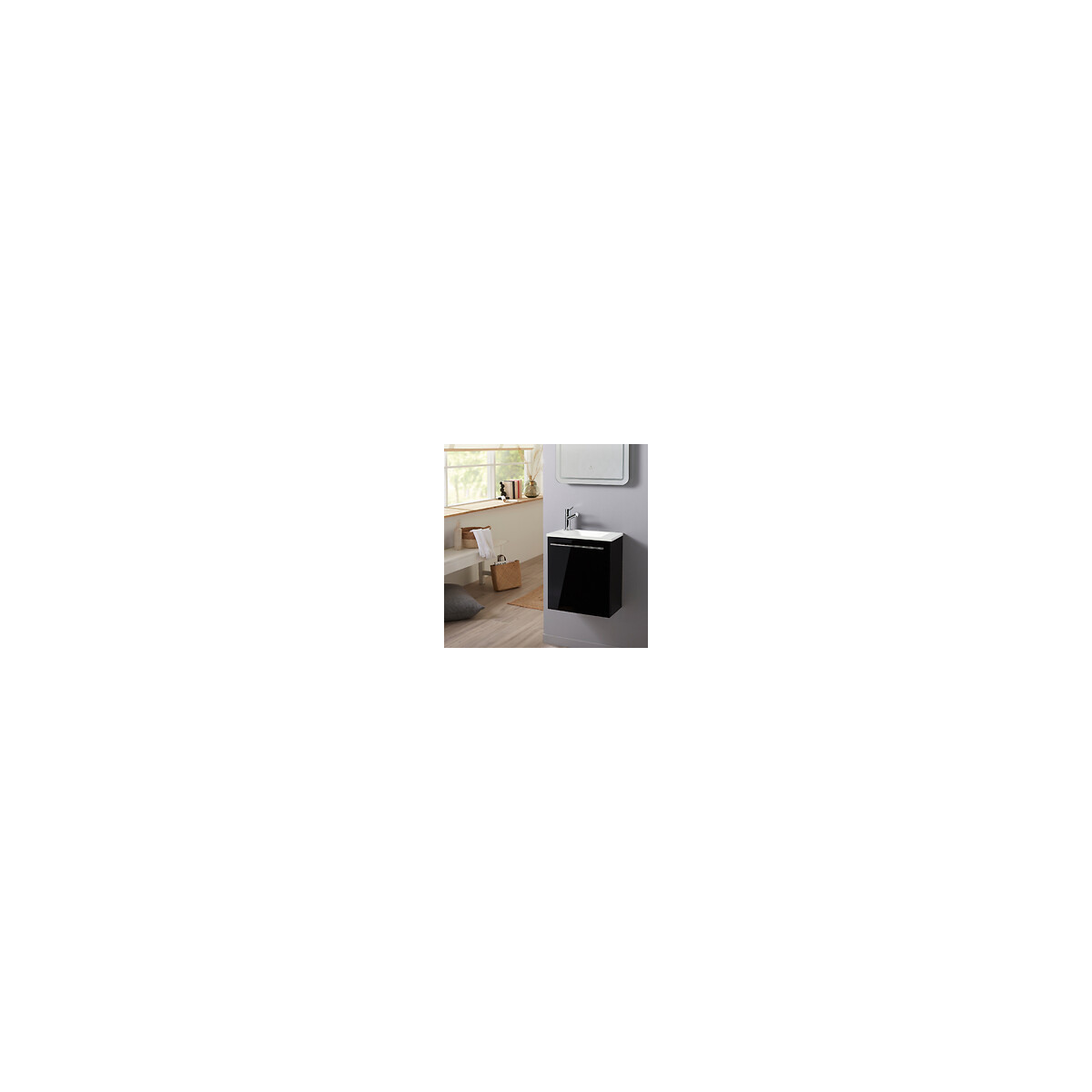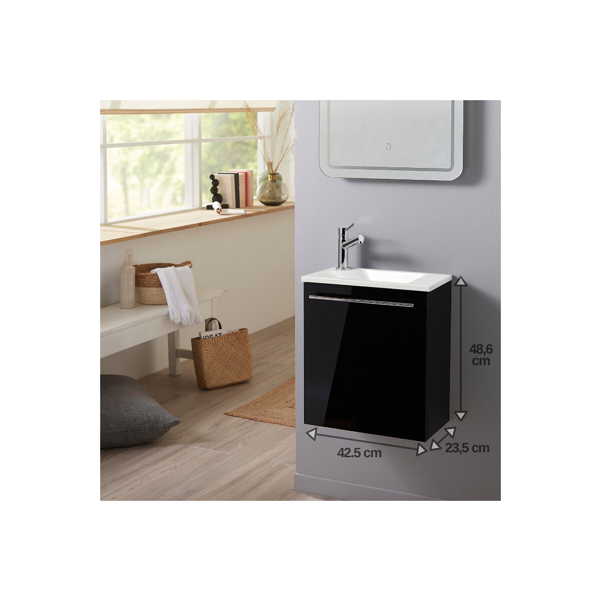 Cet ensemble meuble lave-mains suspendu Hamac couleur Noir contient : Un meuble couleur Noir + un lave-mains en Solid stone blanc + une robinetterie eau froide + une bonde + un siphon + un kit de fixation murale. CARACTÉRISTIQUES TECHNIQUES MEUBLE : Meuble en mélaminé finition laqué 'Noir'. Ce meuble est équipé d'un niveau de tablette. La porte réversible est équipée d'une poignée faisant office de porte serviette. Épaisseur du caisson et de la porte 16mm. Meuble monté en usine. Dimensions du meuble : L 42.5 x H 47 x P 23.5 cm. Conseil : Ne fixer la poignée que lorsque vous aurez choisi le sens d'ouverture de la porte. LAVE-MAINS : Lave-mains en Solid Stone blanc. Lave-mains non réversible. Dimensions du lave-mains : L 42.5 X H 1.6 X P 23.5 cm. ROBINETTERIE : Robinet eau froide. Flexible non inclus.(Raccord mâle 15/21 ou 1/2') Robinet placé à GAUCHE non réversible. VIDAGE : La bonde à écoulement libre et le siphon sont inclus. Fabrication Européenne. PRÉCAUTIONS D'INSTALLATION : La poignée est à monter soi même. Les trous de pré perçage à l 'arrière de la porte sont prévus pour l 'installation de la poignée uniquement à l 'horizontale. Ne fixer la poignée que lorsque vous aurez choisi le sens d'ouverture de la porte. Les meubles doivent être fixés au mur. Utilisez les matériaux de fixation en fonction de vos murs (chevilles et visseries).