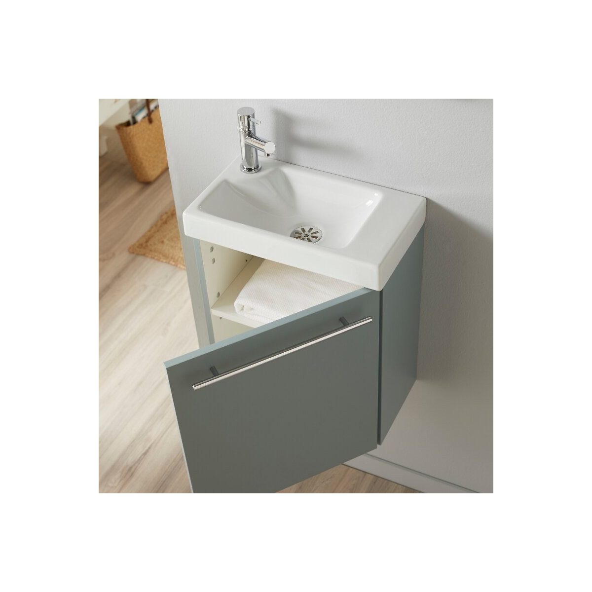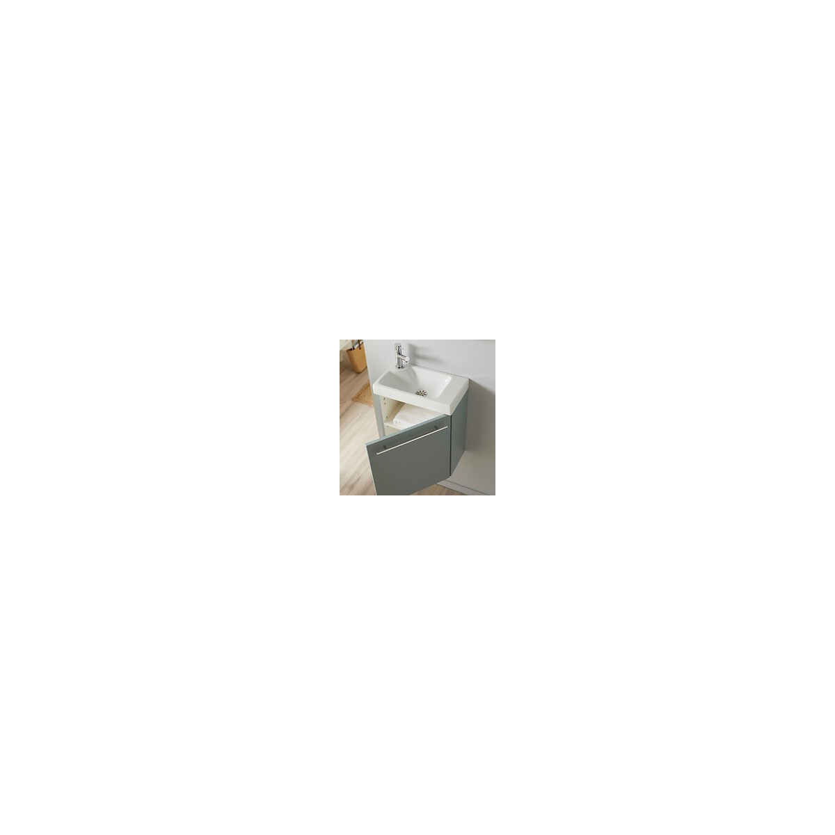 Cet ensemble meuble lave-mains suspendu Hamac couleur Vert de gris contient : Un meuble couleur vert de gris + un lave-mains en céramique + Un mitigeur eau froide / eau chaude (flexibles inclus) + une bonde + un siphon + un kit de fixation murale CARACTÉRISTIQUES TECHNIQUES MEUBLE : Meuble en mélaminé finition mate 'Vert de gris'. Ce meuble est équipé d'un niveau de tablette. La porte réversible est équipée d'une poignée faisant office de porte serviette. Épaisseur du caisson et de la porte 16mm. Meuble monté en usine. Dimensions du meuble seul : L42.5xH47xP23.5 cm. Conseil : Ne fixer la poignée que lorsque vous aurez choisi le sens d'ouverture de la porte. LAVE-MAINS : Lave-mains en céramique blanc. Lave-mains non réversible. ROBINETTERIE : Un mitigeur eau froide / eau chaude (flexibles inclus) Robinet placé à GAUCHE non réversible. VIDAGE : La bonde à écoulement libre et le siphon sont inclus. Fabrication Européenne. PRÉCAUTIONS D'INSTALLATION : La poignée est à monter soi même. Les trous de pré perçage à l 'arrière de la porte sont prévus pour l 'installation de la poignée uniquement à l 'horizontale. Ne fixer la poignée que lorsque vous aurez choisi le sens d'ouverture de la porte. Les meubles doivent être fixés au mur. Utilisez les matériaux de fixation en fonction de vos murs (chevilles et visseries).