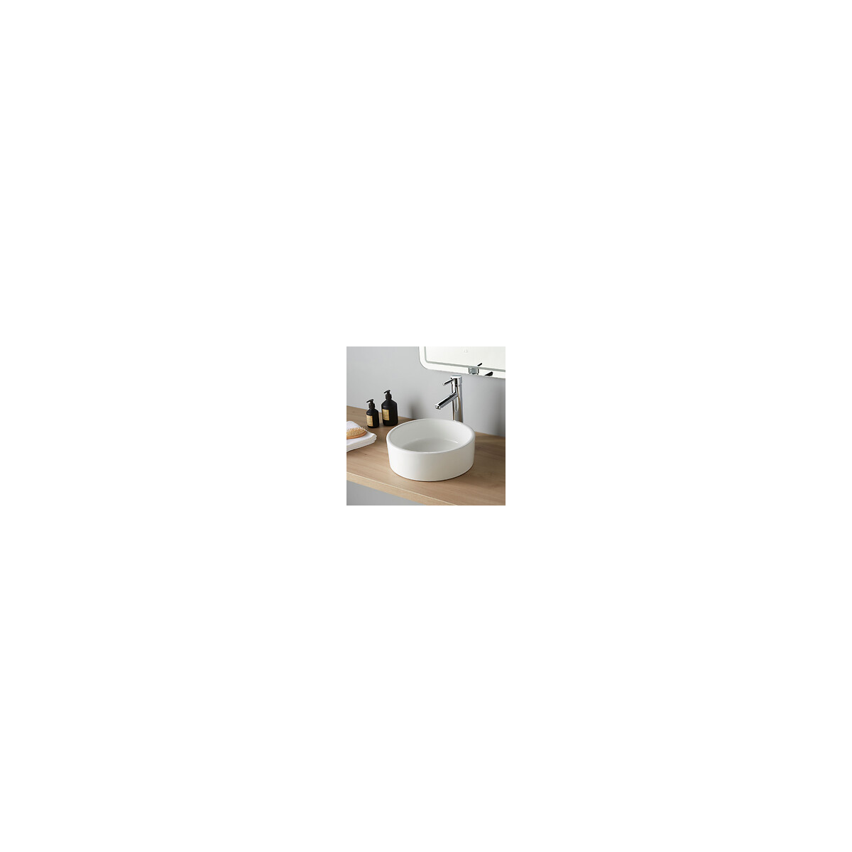 Vasque à poser ronde en céramique blanche de ø 35 cm Vasque sans trop plein Une bonde à écoulement libre accompagnera parfaitement votre produit Livré sans bonde et sans robinetterie Dimensions : H12 x L35 P35 cm EN14688