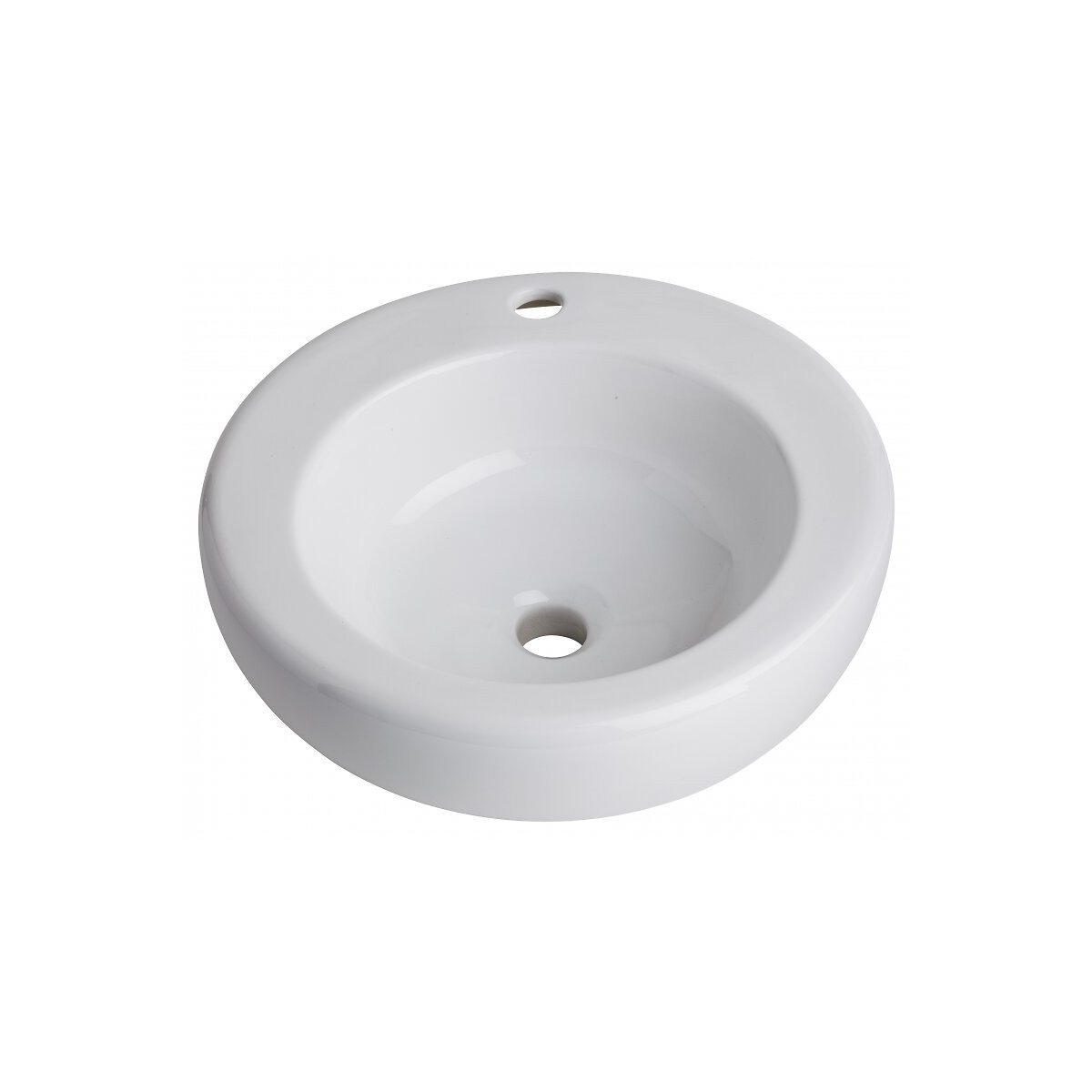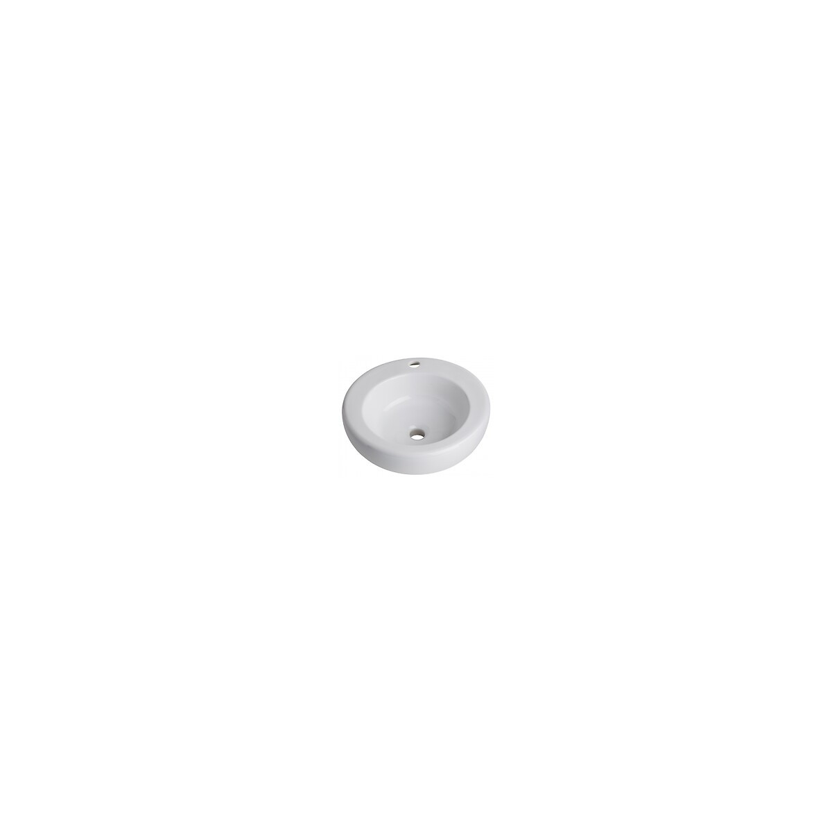 Vasque à poser ronde en céramique blanche Sans trop plein Bonde à écoulement libre Avec plage de robinetterie Livré sans bonde Diamètre intérieur de la vasque : 31.5 cm