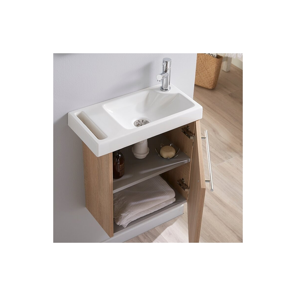 Cet ensemble meuble lave-mains suspendu Hamac couleur OAK BORDOLINO contient : un meuble + un lave-mains en céramique porte serviette + une robinetterie eau froide / eau chaude + une bonde + un siphon + un kit de fixation murale CARACTÉRISTIQUES TECHNIQUES MEUBLE: Meuble en mélaminé décor 'OAK BORDOLINO'. Ce meuble est équipé d'un niveau de tablette. La porte réversible est équipée d'une poignée faisant office de porte serviette. Épaisseur du caisson et de la porte 16mm. Meuble monté en usine. Dimensions du meuble : L42.5xH47xP23.5 cm. Conseil : Ne fixer la poignée que lorsque vous aurez choisi le sens d'ouverture de la porte. LAVE-MAINS : Lave-mains en céramique blanc. Ce lave mains est équipé d'un porte serviette et d'une plage de dépose. Lave-mains non réversible. ROBINETTERIE : Robinet eau froide / eau chaude. Flexibles inclus. Robinet placé à DROITE non réversible. VIDAGE : La bonde à écoulement libre et le siphon sont inclus. Fabrication Européenne. PRÉCAUTIONS D'INSTALLATION : La poignée est à monter soi même. Les trous de pré perçage à l 'arrière de la porte sont prévus pour l 'installation de la poignée uniquement à l 'horizontale. Ne fixer la poignée que lorsque vous aurez choisi le sens d'ouverture de la porte Les meubles doivent être fixés au mur. Utilisez les matériaux de fixation en fonction de vos murs (chevilles et visseries).