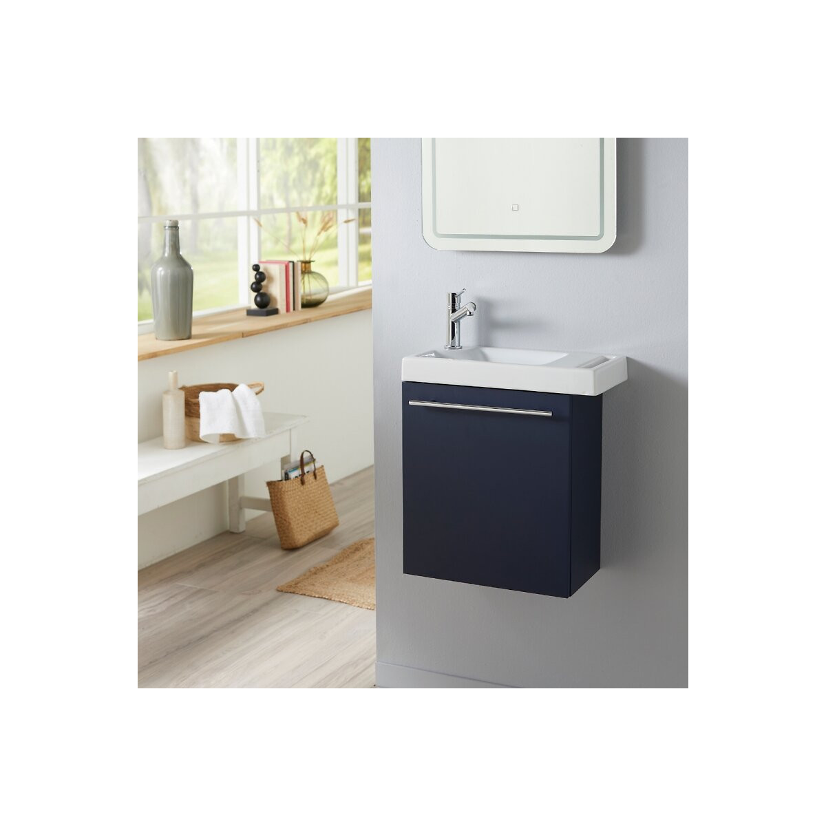 Cet ensemble meuble lave-mains suspendu Hamac couleur Bleu nuit contient : Un meuble couleur Bleu nuit + un lave-mains en céramique porte serviette + Un mitigeur eau froide / eau chaude (flexibles inclus) + une bonde + un siphon + un kit de fixation murale CARACTÉRISTIQUES TECHNIQUES : MEUBLE : Meuble en mélaminé finition mate 'Bleu'. Ce meuble est équipé d'un niveau de tablette. La porte réversible est équipée d'une poignée faisant office de porte serviette. Épaisseur du caisson et de la porte 16mm. Meuble monté en usine. Dimensions du meuble : L42.5xH47xP23.5 cm. Conseil : Ne fixer la poignée que lorsque vous aurez choisi le sens d'ouverture de la porte. LAVE-MAINS : Lave-mains en céramique blanc. Ce lave mains est équipé d'un porte serviette et d'une plage de dépose. Lave-mains non réversible. ROBINETTERIE : Un mitigeur eau froide / eau chaude (flexibles inclus) Robinet placé à GAUCHE non réversible. VIDAGE : La bonde à écoulement libre et le siphon sont inclus. PRÉCAUTIONS D'INSTALLATION : La poignée est à monter soi même. Les trous de pré perçage à l'arrière de la porte sont prévus pour l 'installation de la poignée uniquement à l 'horizontale. Ne fixer la poignée que lorsque vous aurez choisi le sens d'ouverture de la porte Les meubles doivent être fixés au mur. Utilisez les matériaux de fixation en fonction de vos murs (chevilles et visseries).
