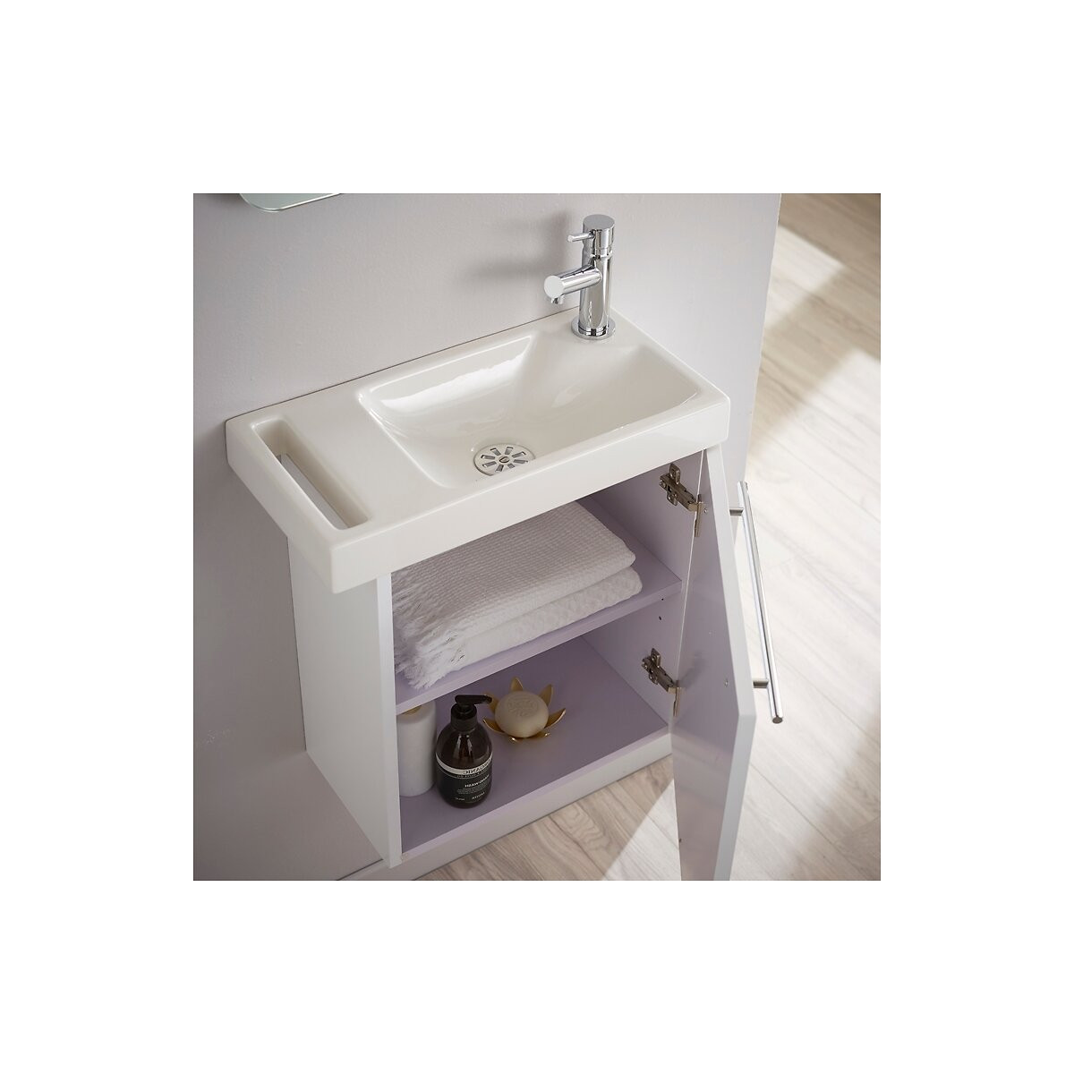 Cet ensemble meuble lave-mains suspendu Hamac couleur BLANC contient : Un meuble + un lave-mains en céramique porte serviette + une robinetterie eau froide / eau chaude + une bonde + un siphon + un kit de fixation murale. CARACTÉRISTIQUES TECHNIQUES MEUBLE : Meuble en mélaminé décor 'BLANC'. Ce meuble est équipé d'un niveau de tablette. La porte réversible est équipée d'une poignée faisant office de porte serviette. Épaisseur du caisson et de la porte 16mm. Meuble monté en usine. Dimensions du meuble : L42.5xH47xP23.5 cm. Conseil : Ne fixer la poignée que lorsque vous aurez choisi le sens d'ouverture de la porte. LAVE-MAINS : Lave-mains en céramique blanc. Ce lave mains est équipé d'un porte serviette et d'une plage de dépose. Lave-mains non réversible. ROBINETTERIE : Robinet eau froide / eau chaude. Flexibles inclus. Robinet placé à DROITE non réversible. VIDAGE : La bonde à écoulement libre et le siphon sont inclus. PRÉCAUTIONS D'INSTALLATION : La poignée est à monter soi même. Les trous de pré perçage à l 'arrière de la porte sont prévus pour l 'installation de la poignée uniquement à l 'horizontale. Ne fixer la poignée que lorsque vous aurez choisi le sens d'ouverture de la porte. Les meubles doivent être fixés au mur. Utilisez les matériaux de fixation en fonction de vos murs (chevilles et visseries).
