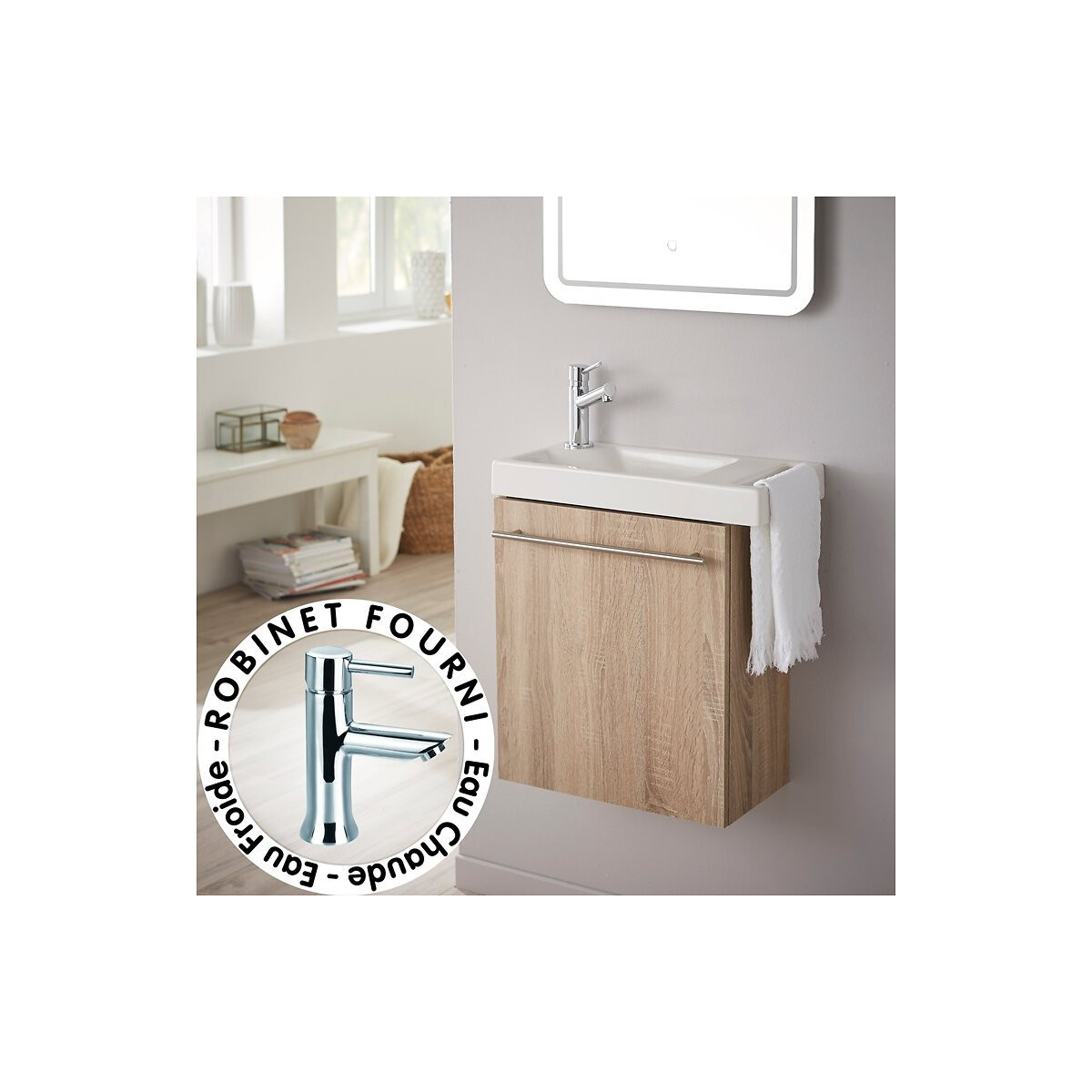 Ce pack lave-mains contient : une meuble + un lave-mains en céramique + un mitigeur eau chaude /eau froide + une bonde + un siphon + un kit de fixations murales Meuble : Meuble en mélaminé décor 'chêne oak bordolino' Fabrication Européenne Ce meuble est équipé d'une tablette La porte est réversible et est munie d'une poignée à placer à l'horizontale Lave-mains : Lave-mains en céramique blanc. Ce lave-mains est équipé d'un porte serviette intégré et d'une plage de dépose Lave-mains non réversible Robinetterie : Ce pack est équipé d'un mitigeur lave mains eau chaude et eau froide. Robinetterie à placer à gauche et non réversible. Ce meuble est livré monté. Conseils : Ne fixez la poignée que lorsque vous aurez choisi le sens d'ouverture de la porte.