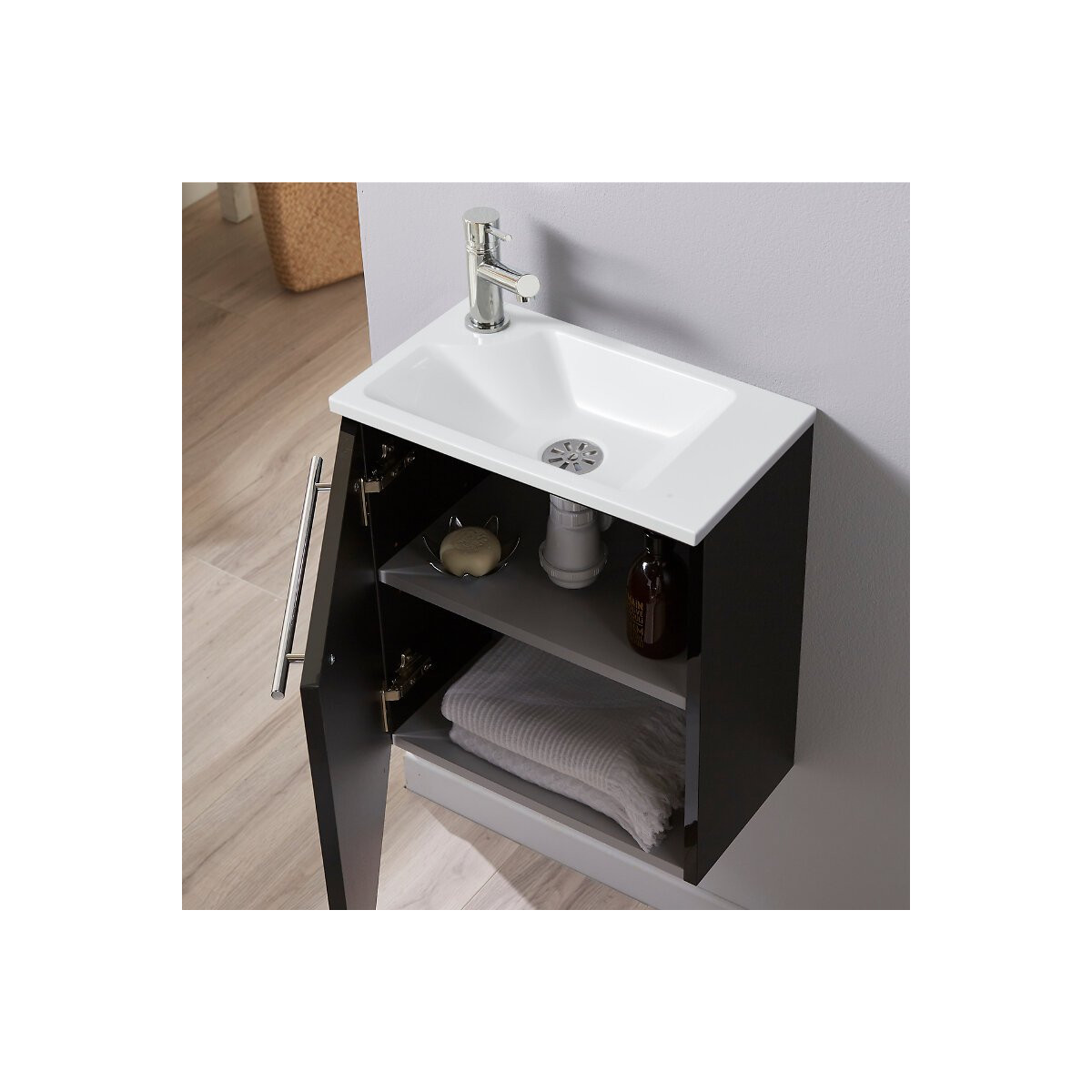 Cet ensemble meuble lave-mains suspendu Hamac couleur noir contient : Un meuble couleur noir + un lave-mains en Solid Stone blanc + un mitigeur eau froide / eau chaude + une bonde + un siphon + un kit de fixation murale. CARACTÉRISTIQUES TECHNIQUES : MEUBLE : Meuble en mélaminé finition laqué 'Noir'. Ce meuble est équipé d'un niveau de tablette. La porte réversible est équipée d'une poignée faisant office de porte serviette. Épaisseur du caisson et de la porte 16mm. Meuble monté en usine. Dimensions du meuble : L 42.5 x H 47 x P 23.5 cm. Conseil : Ne fixer la poignée que lorsque vous aurez choisi le sens d'ouverture de la porte. LAVE-MAINS : Lave-mains en Solid Stone blanc. Lave-mains non réversible. Dimensions du lave-mains : L 42.5 X H 1.6 X P 23.5 cm. ROBINETTERIE : Mitigeur eau froide / eau chaude. Flexible inclus. Robinet placé à GAUCHE non réversible. VIDAGE : La bonde à écoulement libre et le siphon sont inclus. Fabrication Européenne. PRÉCAUTIONS D'INSTALLATION : La poignée est à monter soi même. Les trous de pré perçage à l 'arrière de la porte sont prévus pour l 'installation de la poignée uniquement à l 'horizontale. Ne fixer la poignée que lorsque vous aurez choisi le sens d'ouverture de la porte. Les meubles doivent être fixés au mur. Utilisez les matériaux de fixation en fonction de vos murs (chevilles et visseries).