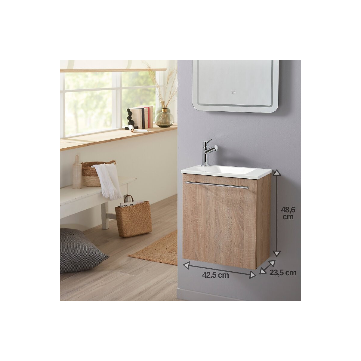 Cet ensemble meuble lave-mains suspendu Hamac couleur chêne Oak Bordolino contient : Un meuble couleur chêne Oak Bordolino + un lave-mains en Solid stone blanc + une robinetterie eau froide + une bonde + un siphon + un kit de fixation murale. CARACTÉRISTIQUES TECHNIQUES MEUBLE : Meuble en mélaminé finition bois 'Chêne Oak Bordolino'. Ce meuble est équipé d'un niveau de tablette. La porte réversible est équipée d'une poignée faisant office de porte serviette. Épaisseur du caisson et de la porte 16mm. Meuble monté en usine. Dimensions du meuble : L 42.5 x H 47 x P 23.5 cm. Conseil : Ne fixer la poignée que lorsque vous aurez choisi le sens d'ouverture de la porte. LAVE-MAINS : Lave-mains en Solid Stone blanc. Lave-mains non réversible. Dimensions du lave-mains : L 42.5 X H1.6 X P 23.5 cm. ROBINETTERIE : Robinet eau froide. Flexible non inclus.(Raccord mâle 15/21 ou 1/2') Robinet placé à GAUCHE non réversible. VIDAGE : La bonde à écoulement libre et le siphon sont inclus. Fabrication Européenne. PRÉCAUTIONS D'INSTALLATION : La poignée est à monter soi même. Les trous de pré perçage à l 'arrière de la porte sont prévus pour l 'installation de la poignée uniquement à l 'horizontale. Ne fixer la poignée que lorsque vous aurez choisi le sens d'ouverture de la porte. Les meubles doivent être fixés au mur. Utilisez les matériaux de fixation en fonction de vos murs (chevilles et visseries).