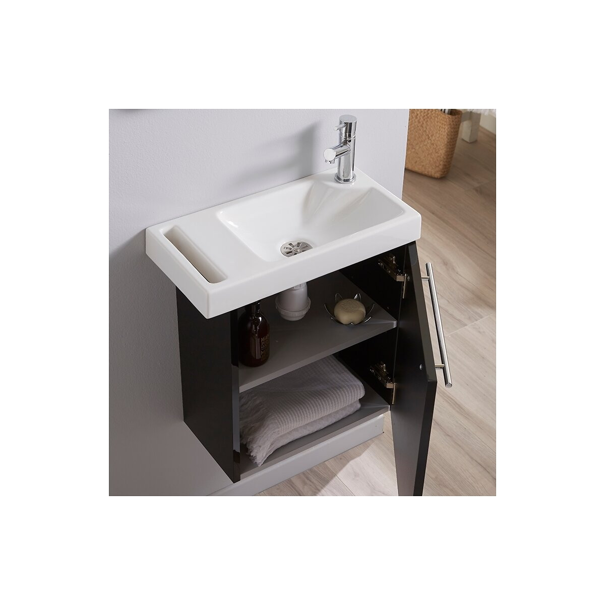 Cet ensemble meuble lave-mains suspendu Hamac couleur NOIR contient : un meuble + un lave-mains en céramique porte serviette + une robinetterie eau froide / eau chaude + une bonde + un siphon + un kit de fixation murale CARACTÉRISTIQUES TECHNIQUES MEUBLE : Meuble en mélaminé laqué noir brillant. Ce meuble est équipé d'un niveau de tablette. La porte réversible est équipée d'une poignée faisant office de porte serviette. Épaisseur du caisson et de la porte 16mm. Meuble monté en usine. Dimensions du meuble : L42.5xH47xP23.5 cm. Conseil : Ne fixer la poignée que lorsque vous aurez choisi le sens d'ouverture de la porte. LAVE-MAINS : Lave-mains en céramique blanc. Ce lave mains est équipé d'un porte serviette et d'une plage de dépose. Lave-mains non réversible. ROBINETTERIE : Robinet eau froide / eau chaude. Flexibles inclus. Robinet placé à DROITE non réversible. VIDAGE : La bonde à écoulement libre et le siphon sont inclus. PRÉCAUTIONS D'INSTALLATION : La poignée est à monter soi même. Les trous de pré perçage à l 'arrière de la porte sont prévus pour l 'installation de la poignée uniquement à l 'horizontale. Ne fixer la poignée que lorsque vous aurez choisi le sens d'ouverture de la porte Les meubles doivent être fixés au mur. Utilisez les matériaux de fixation en fonction de vos murs (chevilles et visseries).