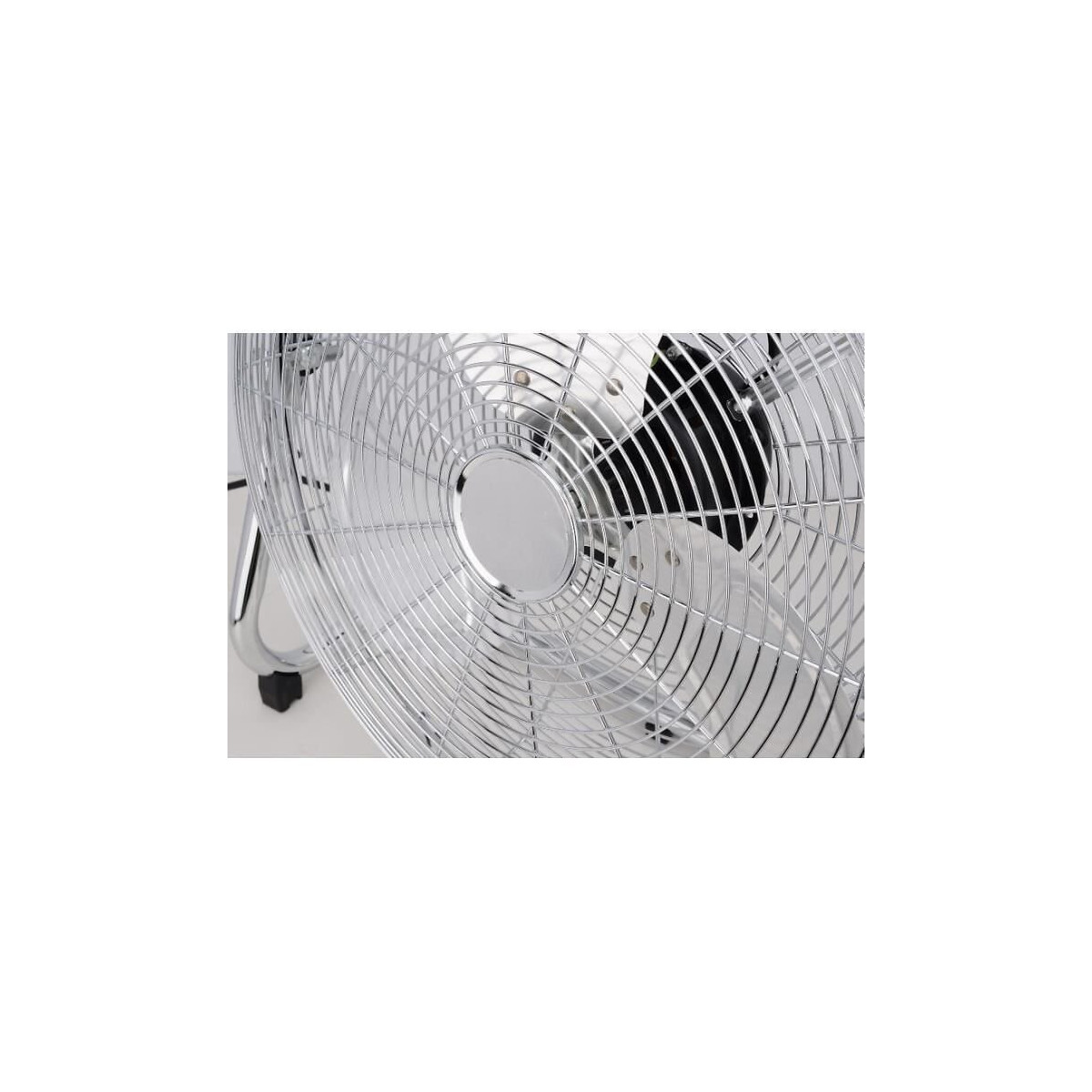 Ventilateur de sol / industriel - Diametre 45 cm - Contrôle de l'inclinaison - 3 vitesses - Puissance : 120 Watts - Grille et base en métal chromé - 3 pâles de couleur transparente - Poignée