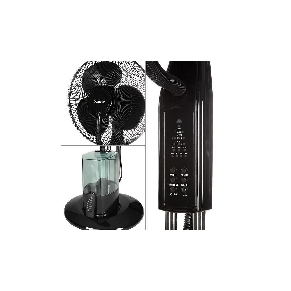 Ventilateur brumisateur - 85 W - Sur pied - Hauteur : 127 cm - Diametre : 40 cm - 3 vitesses - Fonction d'oscillation - 3 modes de fonctionnement (Normal / Nature / Sommeil) - Niveau sonore : 55,2 dB - 3 niveaux de brumisation (de 9 a 15 h) - Télécommande - Minuteur : jusqu'a 7h30 - Réservoir 3 Litres - 4 roulettes - Coloris : Noir