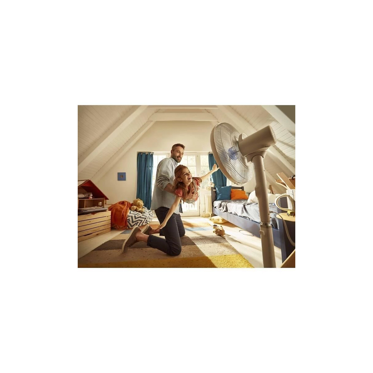 Ventilateur sur pied - Moteur ProSmart Inverter 30 watts - 12 niveaux de vitesse - Ecran LCD blanc pour des réglages simples - 5 pales au design aérodynamique - Minuteur - Télécommande - Technologie de pointe : seulement 27 dB(A) - Hauteur ajustable - Poignée de transport - Blanc Ce ventilateur est doté d'un mode brise pour la nuit et fait partie des plus silencieux de sa catégorie.