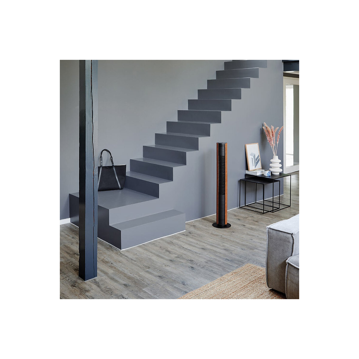 Un grand homme même pour de petits espaces Avec son élégance, ses courbes élancées et son revêtement en similicuir, PETER Cognac se fond dans toutes les pièces de votre maison. Son Mode Oscillation et ses 3 vitesses de ventilation lui permettent de couvrir une large surface, tout en assurant une distribution optimale de l'air frais. Sa taille et sa finesse en font le compagnon des petites pièces puisque son emprise au sol est très faible. Le Mode "Brise naturelle" PETER Cognac possède un Mode spécifique et original appelé "Brise naturelle". Cette technologie lui permet de reproduire le souffle naturel du vent, comme si vous étiez dans une forêt. Il alterne différentes vitesses de ventilation et d'oscillation. Ainsi, le flux d'air n'est pas continu ni dirigé sans cesse au même endroit, ce qui est agréable. Au choix : panneau de contrôle ou télécommande PETER Cognac dispose d'un panneau de contrôle tactile situé sur le haut de l'appareil vous permettant de contrôler chacune de ses fonctions. Et s'il fait trop chaud pour vous déplacer, n'hésitez pas à utiliser sa télécommande pour modifier les réglages de votre ventilateur. Pour ne pas la perdre, vous pouvez la ranger dans le logement prévu à cet effet, à l'arrière de l'appareil. De la fraîcheur même la nuit Grâce à son Mode Nuit – qui permet de désactiver les LEDs– et à sa fonction Timer – qui permet de programmer sa durée de fonctionnement –, PETER Cognac est le ventilateur idéal pour une chambre. Vous pouvez ainsi dormir au frais, en silence et en toute tranquillité.