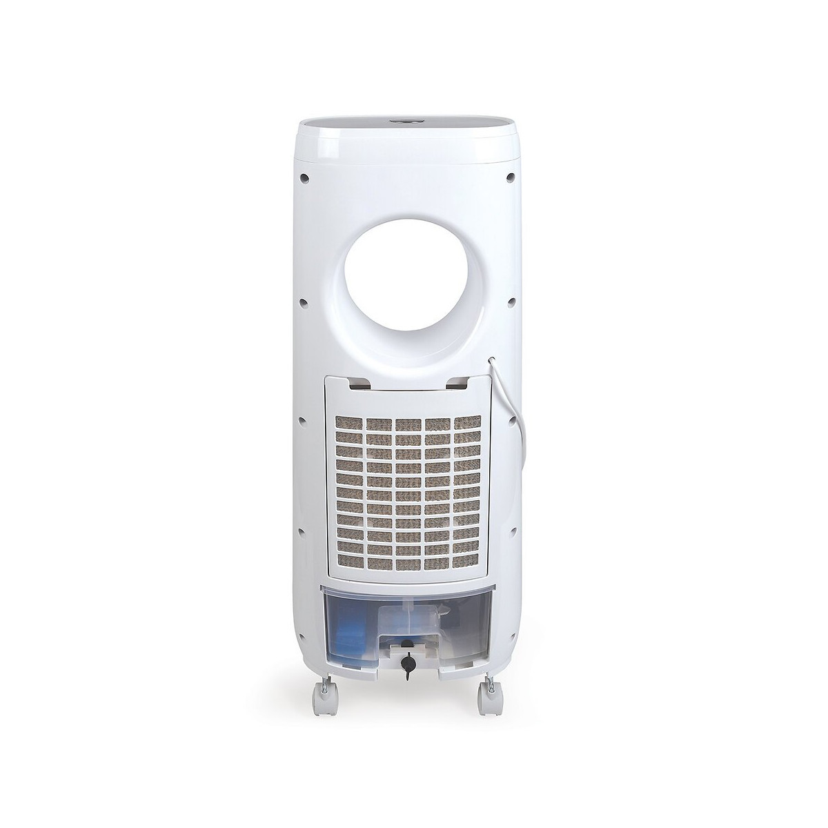dom444 - Rafraichir l'air intérieur facilement ! Le rafraîchisseur d'air est un appareil qui permet de faire baisser la température ressentie dans la pièce en brassant de l'air frais grâce à des blocs réfrigérants. Cette solution est économique puisque l'appareil consomme peu d'énergie. Les 3 vitesses de ventilation permettent de profiter d'une brise légère ou plus soutenue. Il est également possible de régler la ventilation en mode nature, la vitesse change alors de façon aléatoire ou en mode nuit, la vitesse diminue par pallier avant de s'éteindre automatiquement. La grille oscille automatiquement à 120° afin de créer un effet de vent agréable dans la pièce. L'appareil peut servir de purificateur d'air grâce à son système d'ioniseur. Les ions négatifs attirent les particules polluantes présentes dans l'air telles que les poussières, le pollen et les dégradent pour assainir l'air ambiant. Profitez également d'un humidificateur d'air puisque l'appareil dispose d'un réservoir d'eau d'une capacité de 4L permettant d'envoyer de l'air humidifié au sein de la pièce, grâce à un volume de brumisation efficace de 300 m3/h. - Rafraichisseur d'air mobile Puissance : 80 W 3 fonctions : rafraichisseur, humidificateur, purificateur Réservoir d'une capacité de 4 L 3 vitesses de ventilation Grille oscillante automatique à 120° Minuterie jusqu'à 7,5 heures Panneau de contrôle tactile Télécommande Socle équipé de 4 roulettes 2 Blocs réfrigérant inclus Volume de brumisation max : 300 m3/h Silencieux : en dessous de 60 dB Panneau de contrôle digital Type de pile : CR2025 Nombre de piles : 1 Matière : ABS Secteur : Fiche ronde Dimensions : 23 x 33 x 82 cm Poids : 4.9 kg Couleur : Blanc
