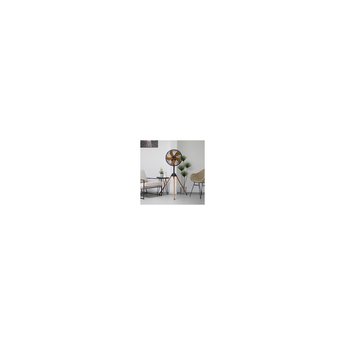 dom446 - Un design irrésistible Avec son design vintage, ce ventilateur trépied permet de profiter d'une brise de fraîcheur tout en apportant une belle touche de décoration à votre intérieur. Les pieds et les pâles en imitation bois se fondent parfaitement avec la structure en métal noir, permettant d'apporter un cachet supplémentaire dans le salon par exemple. Un ventilateur performant Avec une hauteur réglable jusqu'à 130 cm et un diamètre de 40 cm, le ventilateur est idéal pour apporter de l'air dans les pièces à vivre. Les 3 vitesses de ventilation et l'oscillation horizontale permettent de réguler le flux d'air ambiant et de créer différents types de courant d'air. Le ventilateur est en mesure d'envoyer un flux d'air de 5,3m3/min. Avec un niveau de bruit de 58 dBA, l'appareil fonctionne silencieusement, vous permettant de l'utiliser de nombreuses heures sans être dérangé. - Ventilateur trépied Puissance : 50 W Ø 40 cm 3 vitesses de ventilation Oscillation horizontale Tête inclinable Hauteur réglable jusqu'à 130 cm Hauteur : 130 cm Silencieux : 58 dBA Flux d'air de 5,3 m3/min Matière : métal Dimensions : 85 x 85 x 130 cm Poids : 5.24 kg Couleur : noir