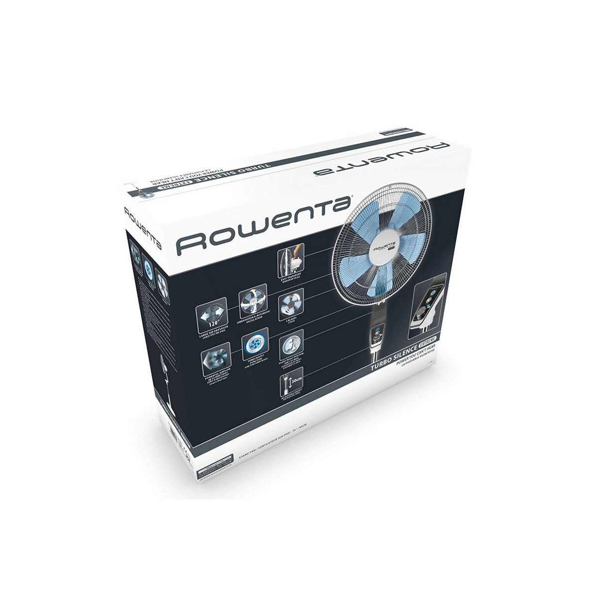 Ventilateur sur pied - Diametre : 40 cm - Doté : technologie silence - Débit d'air : jusqu'a 80 m³ - Fonction Turbo boost - Orientation réglable - Oscillation automatique - Ajustable en hauteur - Poignée de transport intégrée - Hélice a 5 pales