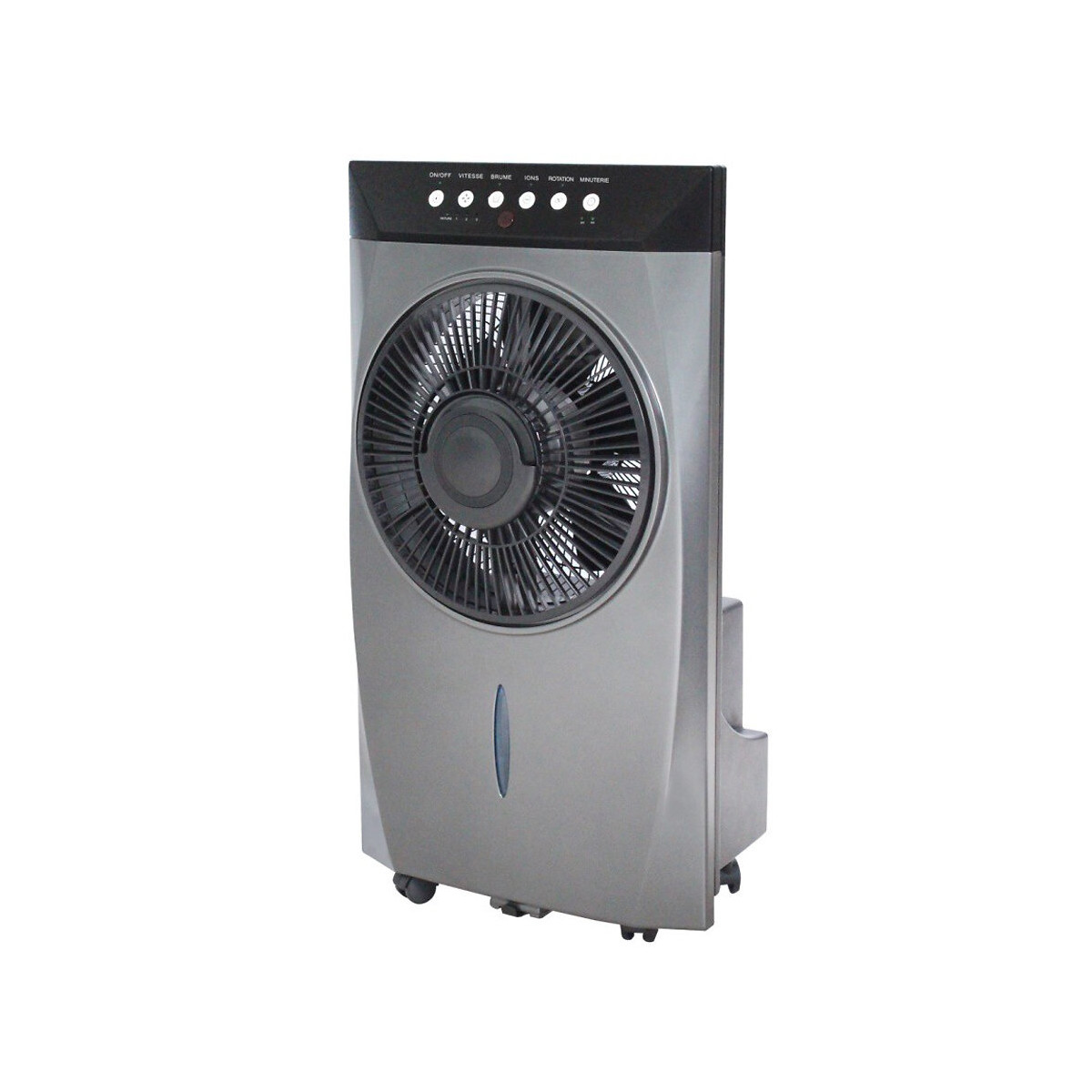 wcf-05r - Appareil qui combine 4 fonctions: Rafraichissement de l'air (fonction brumisateur avec ventilateur ), ventilation seule, humidificateur et ionisation Très léger, très maniable, très mince - Puissance: 80 W (45W en ventilation seule) 4 fonctions: Rafraichissement de l'air (fonction brumisateur avec ventilateur ), ventilation seule, humidificateur et ionisation 3 vitesses de ventilation + grille rotative en sens inverse pour créer des turbulences Avec Minuteur : 9 heures Purification et assainissement de l'air : Générateur d?ions négatifs Réservoir 1,8 litres avec niveau d'eau visible Roulettes de déplacement Fourni avec une télécommande à infrarouges Dimensions : 66 x 35 x25 cm Poids : 5 kg Couleur : Gris et noir