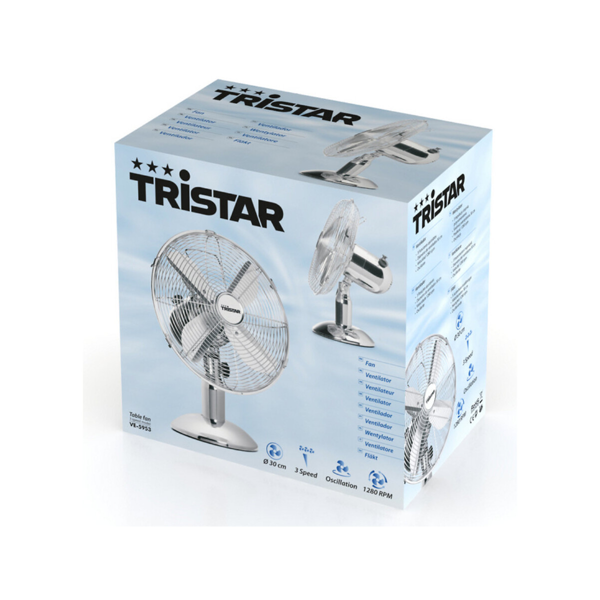 ve5953 - Ventilateur de table Tristar VE5953 oscillant. Ce ventilateur chromé d'un diamètre de 30 cm est très stable. Avec ses 3 vitesses, vous l'ajustez selon vos besoins. - 3 Positions règlables. Diamètre ventilateur : 30 cm. Vitesse : 1280 rpm. Oscillant. Puissance : 35 Watts. Dimensions L x B x H (cm) : 35 x 26.5 x 45.5. Poids net (kg) : 3.8. Poids brut (kg) : 4.8. Coloris : Chrome.