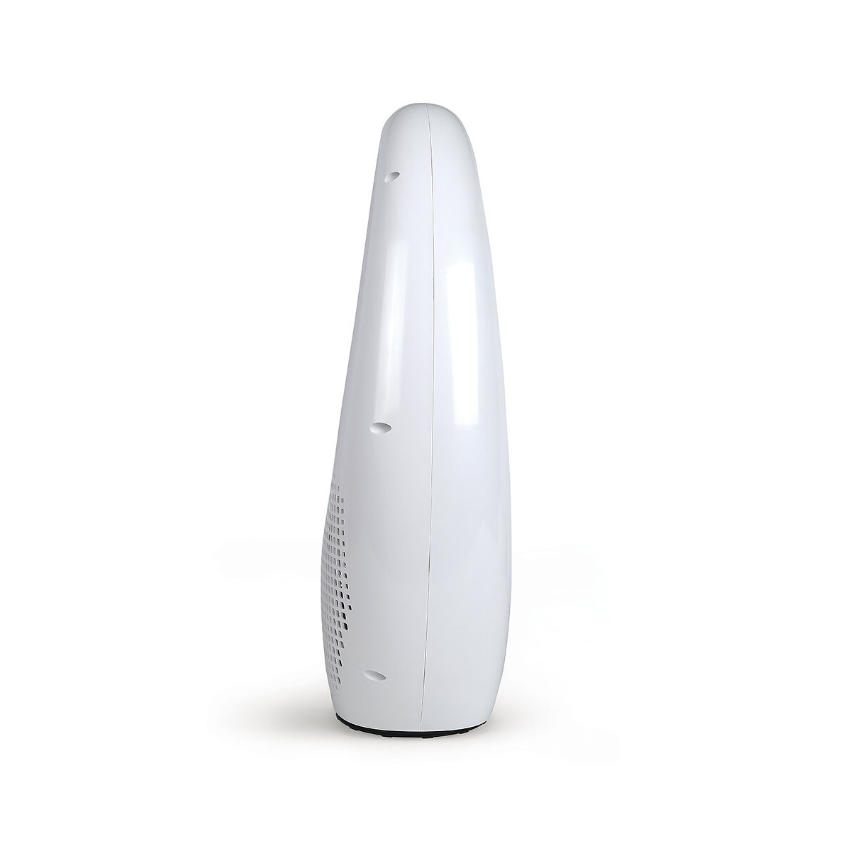 dom450 - Un ventilateur design et épuré ! Le ventilateur sans pale permet de profiter d'un appareil design, ultra silencieux, sans danger et facile à nettoyer. Compact et léger, le ventilateur mesure seulement 58 cm de haut et peut aussi bien être posé sur le sol ou trouver sa place sur une table ou un meuble. Doté d'un halo lumineux central avec 4 couleurs au choix, l'appareil permet d'ajouter une touche de style et de créer une ambiance colorée au sein de votre salon. Pour une sensation de fraîcheur instantanée. Ce modèle permet de créer un flux d'air puissant pour apporter une sensation de fraîcheur dans la pièce. Les 3 vitesses de ventilation permettent d'adapter la puissance selon vos préférences. L'appareil dispose également d'une fonction oscillation à 60° afin de reproduire un léger courant d'air par intermittence près de vous. Pour plus de confort, le ventilateur dispose d'une minuterie programmable jusqu'à 7h30 ainsi que d'une télécommande pour pouvoir contrôler votre appareil depuis le bureau ou le canapé. - Ventilateur sans pale Puissance : 40 W De table ou à poser 3 vitesses de ventilation Veilleuse 4 couleurs: bleu clair / violet / bleu / vert Fonction oscillation à 60° Minuterie jusqu'à 7h30 Télécommande Hauteur : 58 cm Silencieux : 59 dBA Flux d'air de 35,2 m3/min Type de pile : CR2025 Nb de piles : 1 Matière : ABS Dimensions : 29 x 17 x 58 cm Poids : 3 kg Couleur : blanc
