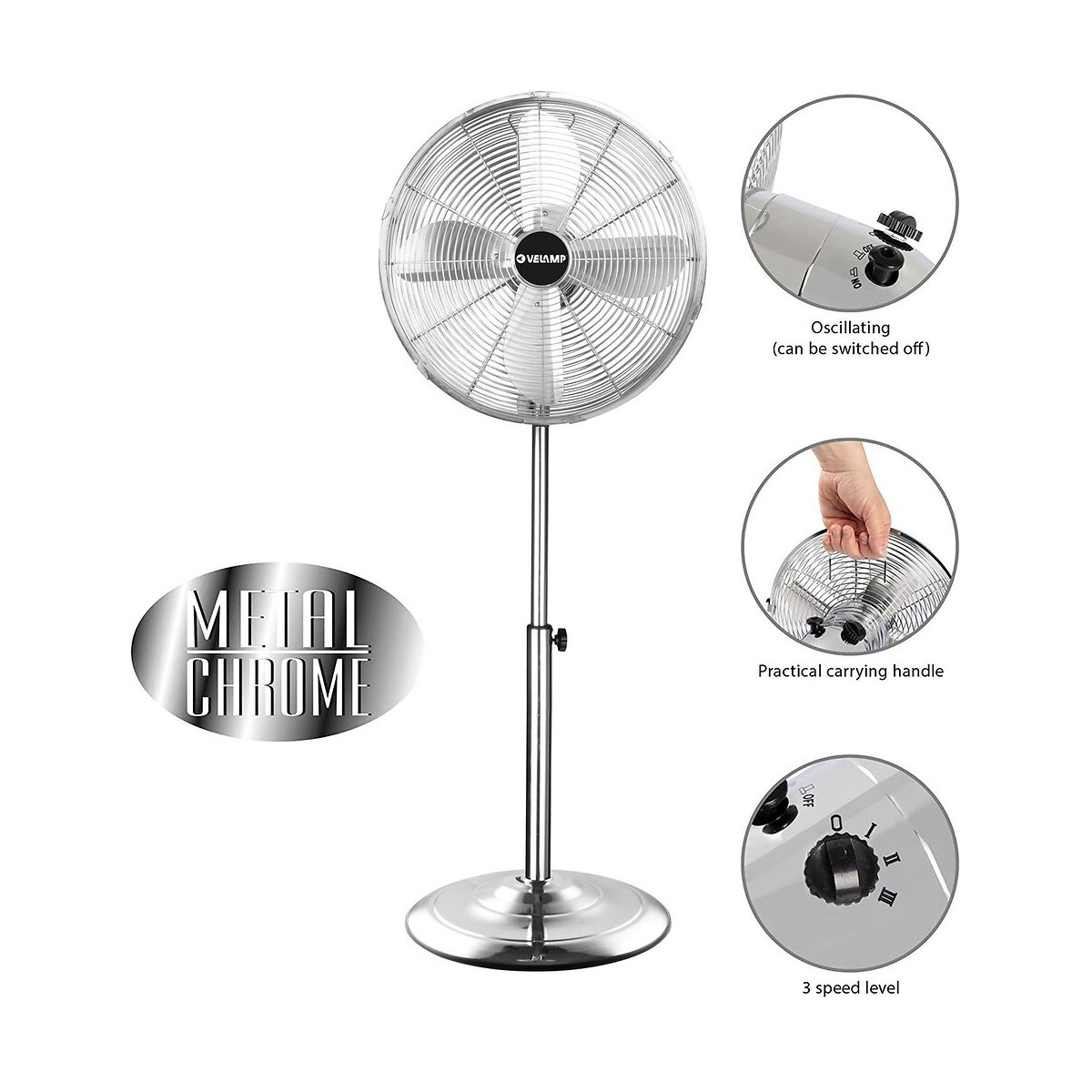 Lames métalliques de 40 cm de diamètre; hauteur max: 130 cm; hauteur min: 84 cm. Rotation latérale automatique et inclinaison réglable; équipé de boutons pour sélectionner les 3 vitesses; puissance max: 50W: puissant et stable. Base de support large: le ventilateur est stable et ne tremble pas. Assemblage facile avec petit nombre de composants. Moteur avec bobine de cuivre pour un fonctionnement durable. Velamp est une marque italienne: nos produits sont soignés, aux normes et de qualité.