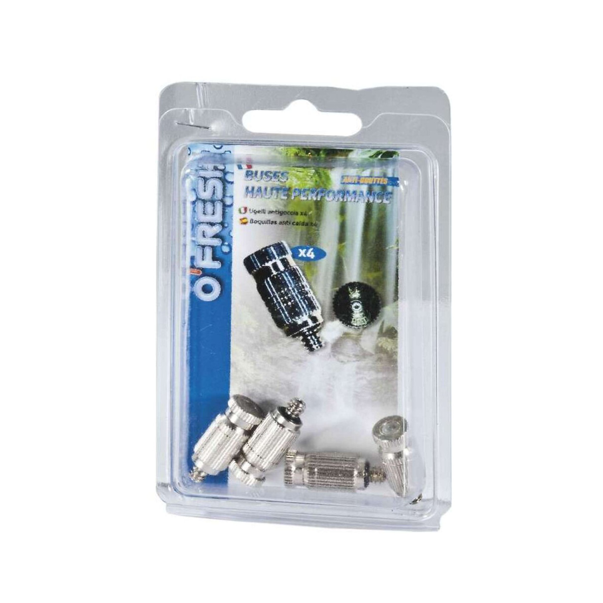 Produit vendu par 4 pièces et adaptables sur les produits O'Fresh. adaptable sur le système de brumisation 6 m, 10 m et extension 3 m et brumisateur de camping. Ces buses peuvent remplacer les buses bouchées ou usées de votre circuit de brumisateur.