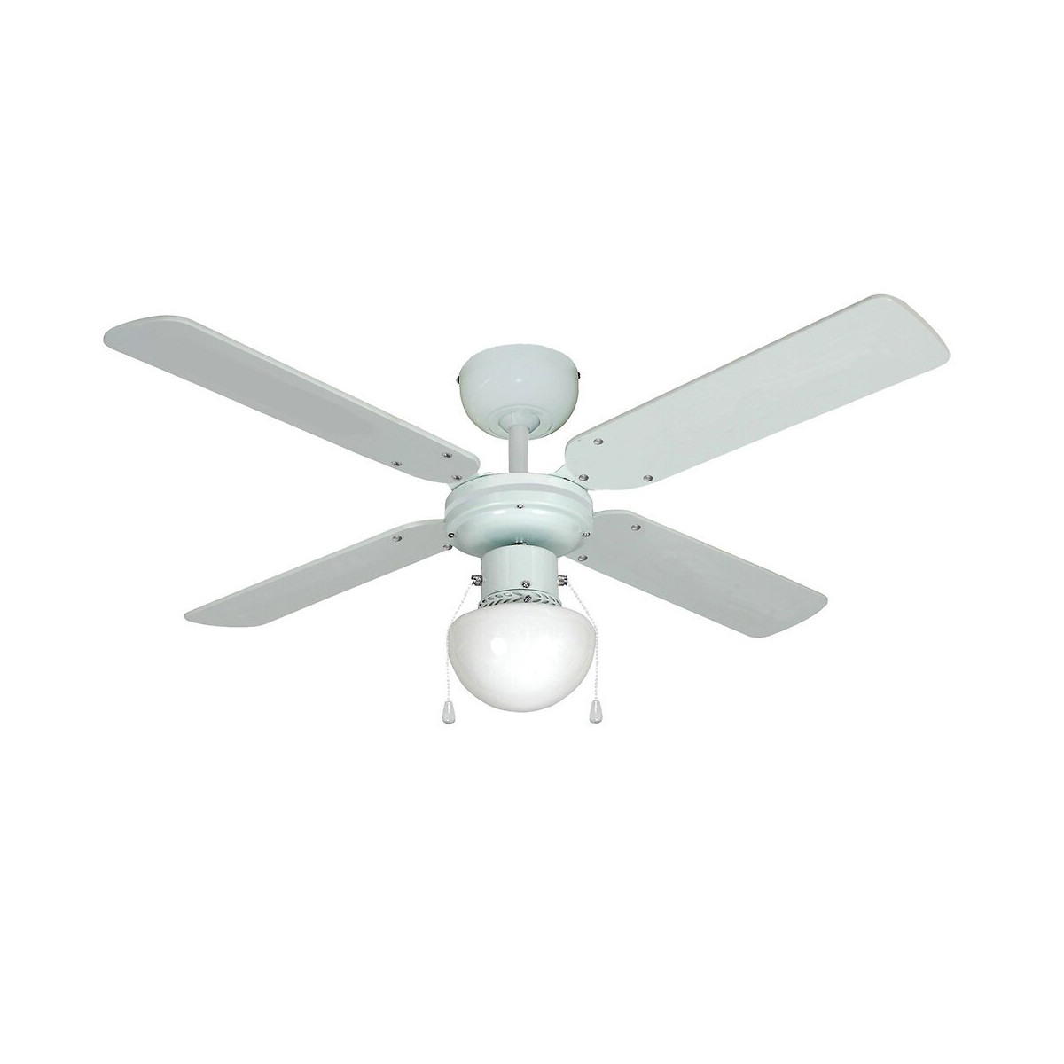 Ventilateur de plafond 105 cm 4 pales : Caractéristiques : Avec 1 globe 3 vitesses . Fonction réversible été/hiver Matière : bois et métal. Coloris : blanc. Ampoule non fournie