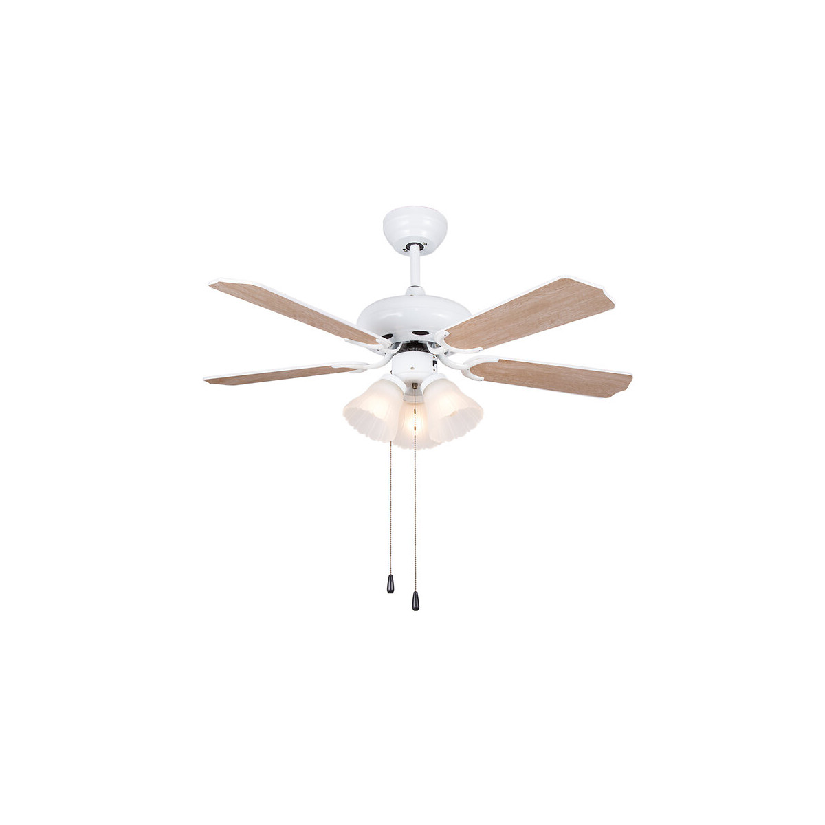 Ventilateur de plafond AC de 132cm de diamètre, avec un corps finition blanc et cinq pales réversibles blanc et bois pine. Système de fixation directe au plafond idéal pour les espaces de faible hauteur. Avec trois abat-jours en verre opale et E27 (ampoules non incluses). Il est activé au moyen de deux chaînes avec une poignée décorative. /> ADAPTÉ AUX SURFACES SUPÉRIEURES À 20M2. Avec mode été / hiver inclus. Dimensions: 132x40cm. Vitesses: 1/2/3. Consommation: 28/46/65 W / h. RPM: 105/160/195. Débit d'air: 85/127/155 m3 / min. Niveau sonore: 38/43/49 dB. Poids net: 8,2 kg