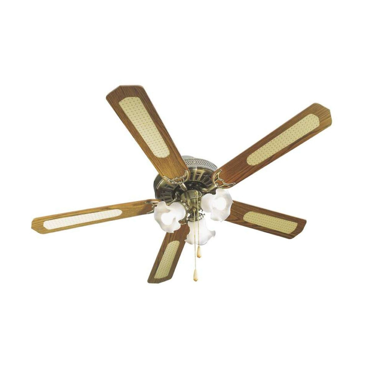 Les ventilateurs de plafond sont livrés sans ampoule, sans télécommande. Caractéristiques: 5 pales Ø 132 cm. 3 tulipes. 3 vitesses. Sens de rotation réversible.