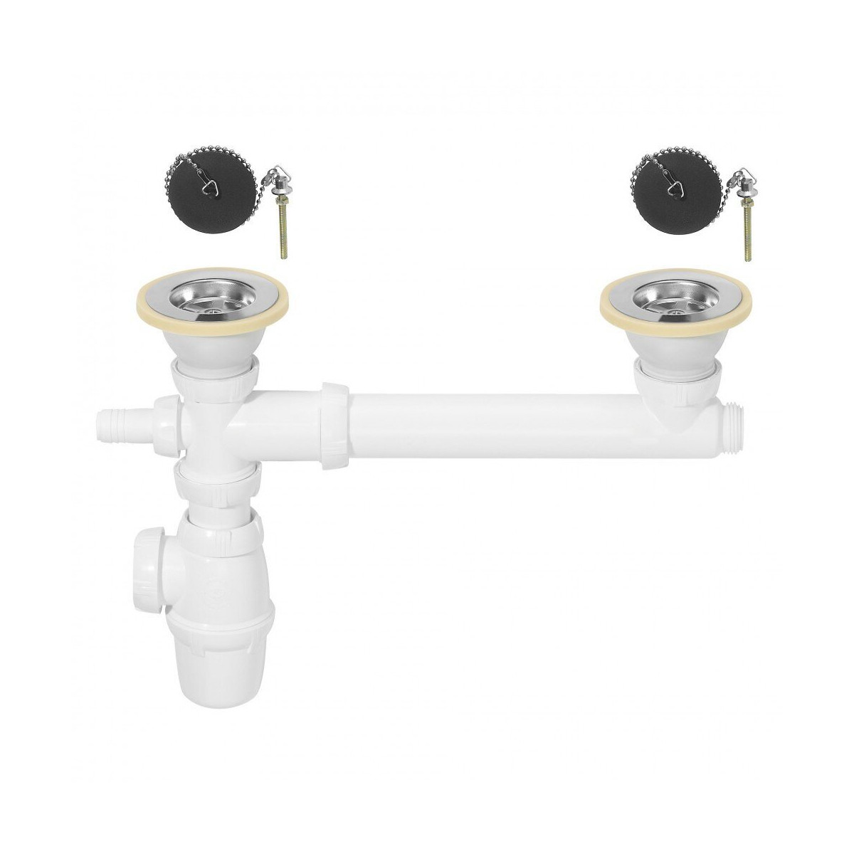 Vidage pour évier 2 bacs Ø60 mm (grès ou synthèse) avec prise machine à laver. Pour évier grès ou synthèse 2 bacs Ø60 mm Siphon réglable en hauteur Bonde à bouchon à chaînette Prise machine à laver Ensemble complet pour évier 2 bacs Ø60 mm (grès), sans trop-plein. Siphon réglable en hauteur, tubulure extensible de 110 à 325 mm, prise machine à laver, 2 bondes NF à bouchon. Nom du produit: Vidage Marque du produit: WIRQUIN Gain de place: Oui Produit emballé : hauteur (en cm): 10 Produit emballé : largeur (en cm): 22 Produit emballé : profondeur (en cm): 25 Produit emballé : poids (en kg): 0.6