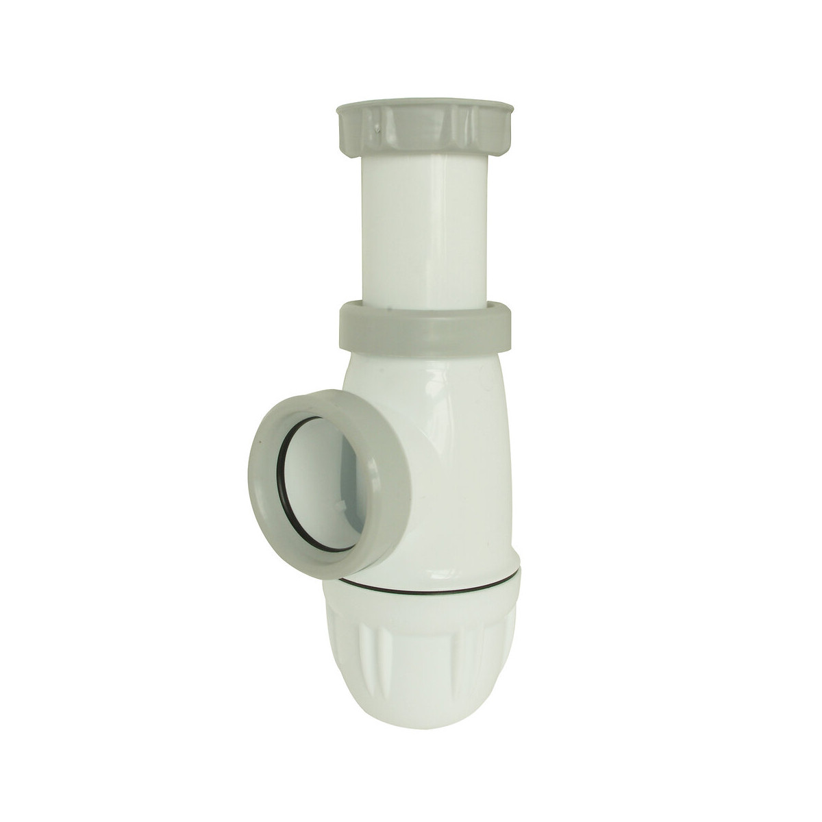 Siphon en plastique blanc Le raccordement se fait par emboîtement et il est réglable en hauteur Arrivée 40/49 - Sortie pour tube de 40 Garde d'eau 50mm. Débit 52 l/min (sous 120mm d'eau)