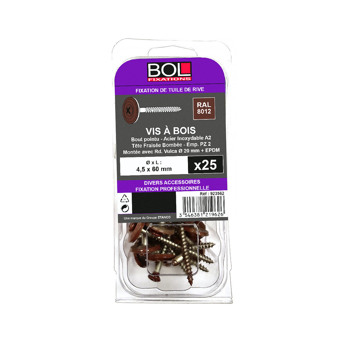 25 vis inox A2. Diamètre : 4,5 mm x 60 mm. Empreinte pozidriv avec rondelle d'étanchéité. Coloris : rouge tuile. RAL 8012 pour fixation de rive.Spécifications techniques
