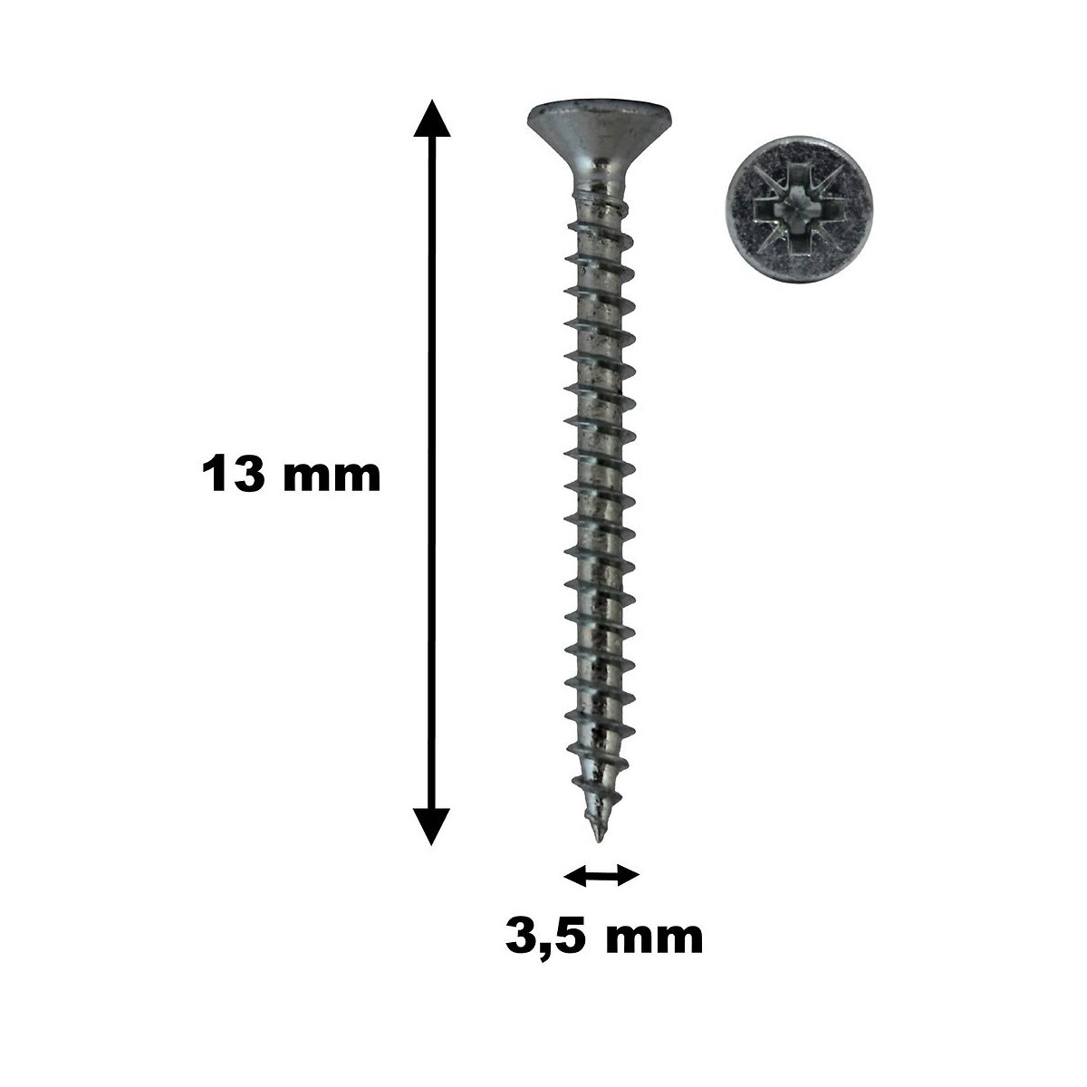 - Tête fraisée - Filetage total - Acier zingué blanc - Empreinte de la tête : cruciforme (PZ) - Diamètre : 3.5 mm - Longueur : 13 mm - Conditionnement : 100 vis Livraison rapideSpécifications techniques