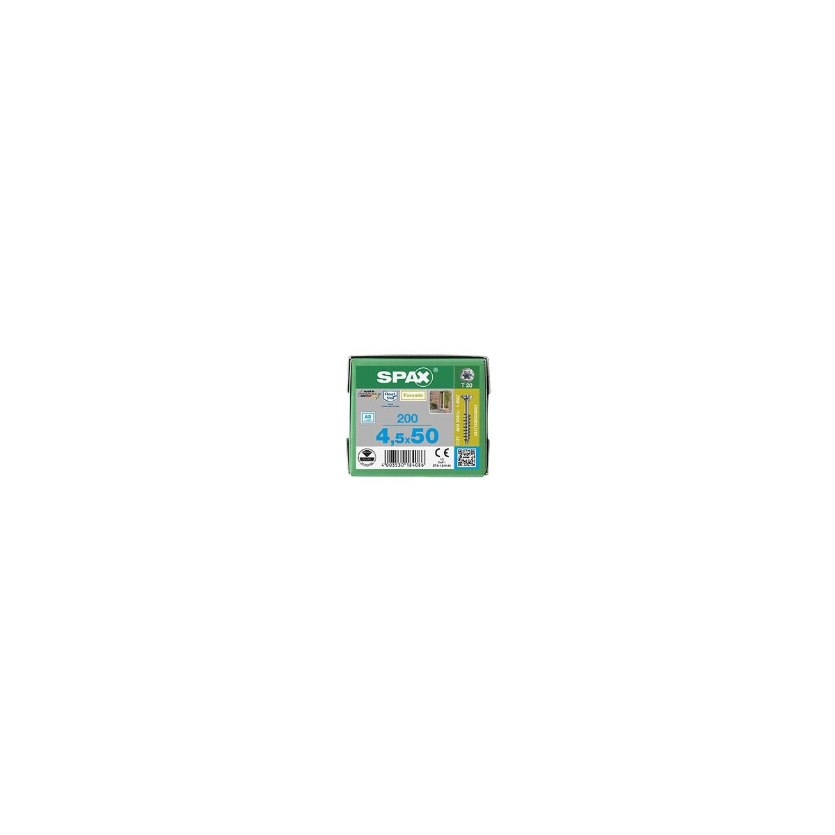 La vis idéale pour les façades en bois résineux ! Découvrez le plaisir d'un vissage facile, même des bois durs et tropicaux sans épissure, ni déformation du bois. Lors du choix de votre vis, il est conseillé pour une lame de bois de 24mm, une vis de 60mm de long (x2,5). Utilisation : Façades en bois Réduit l'épissurage et le voilement du bois Enfoncement propre grâce aux nervures fraisées Réduit la formation de rouille sur la façade +Produit : La technologie T-STAR plus permet un logement optimal de l'embout et un meilleur guidage. Un travail au-dessus de la tête de vis est possible sans problème grâce au maintien renforcé. La tête bombée avec ses nervures fraisées permet un enfoncement propre et net de la tête. Le profil ondulé typique SPAX Jusqu'à la pointe, permet un vissage rapide et sûr. La pointe CUT permet le vissage sans avant-trou dans les bois tendres (il est tout de même conseillé de percer un avant-trou dans les bois durs), réduit l'épissurage, le carré déplace les fibres. Caractéristiques techniques : - Ø du filetage : 4,5 mm - Longueur totale : 50 mm - Longueur filetage partiel : 32 mm - Type d'embout T : 20 - Quantités de vis : 200 Certification : CE 12/0114Spécifications techniques