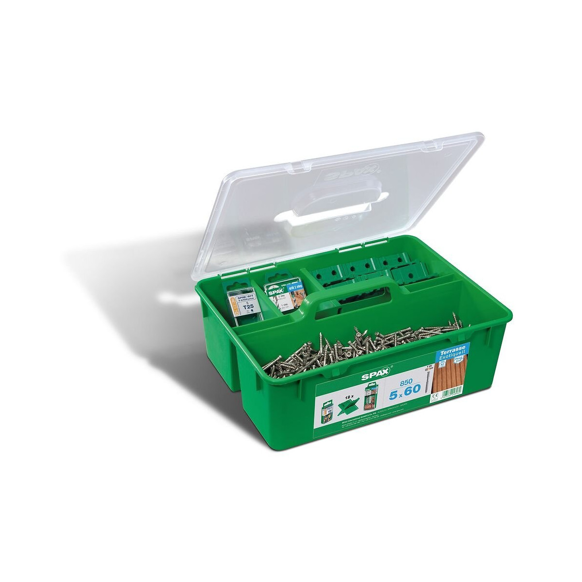 Kit complet pour la pose de votre terrasse adapté au bois éxotique. Le kit contient 850 vis 5x60 en inox A2, 1 foret étagé avec 2 niveaux de perçage 4.1 / 6.5mm longueur 48mm, 12 espaceurs (pour joint 4, 5, 6, 7mm) et 5 embouts T-STAR plus T25. +Produit : La technologie T-STAR plus permet un logement optimal de l'embout et un meilleur guidage. Un travail au-dessus de la tête de vis est possible sans problème grâce au maintien renforcé. L'aspect parfait de la tête permet de réduire l'effet de fissuration lors de la pénétration par la tête cylindrique. Le profil ondulé typique SPAX Jusqu'à la pointe, permet un vissage rapide et sûr. Le filetage de fixation permet d'assembler fixement et durablement deux morceaux de bois. La pointe CUT permet le vissage sans avant-trou dans les bois tendres (il est tout de même conseillé de percer un avant-trou dans les bois durs), réduit l'épissurage, le carré déplace les fibre. Caractéristiques techniques : - Ø du filetage : 5,0 mm - Longueur totale : 60 mm - Longueur filetage partiel : 21 mm - Type d'embout T : 25 - Quantités de vis : 850 Certification : CE 12/0114Spécifications techniques