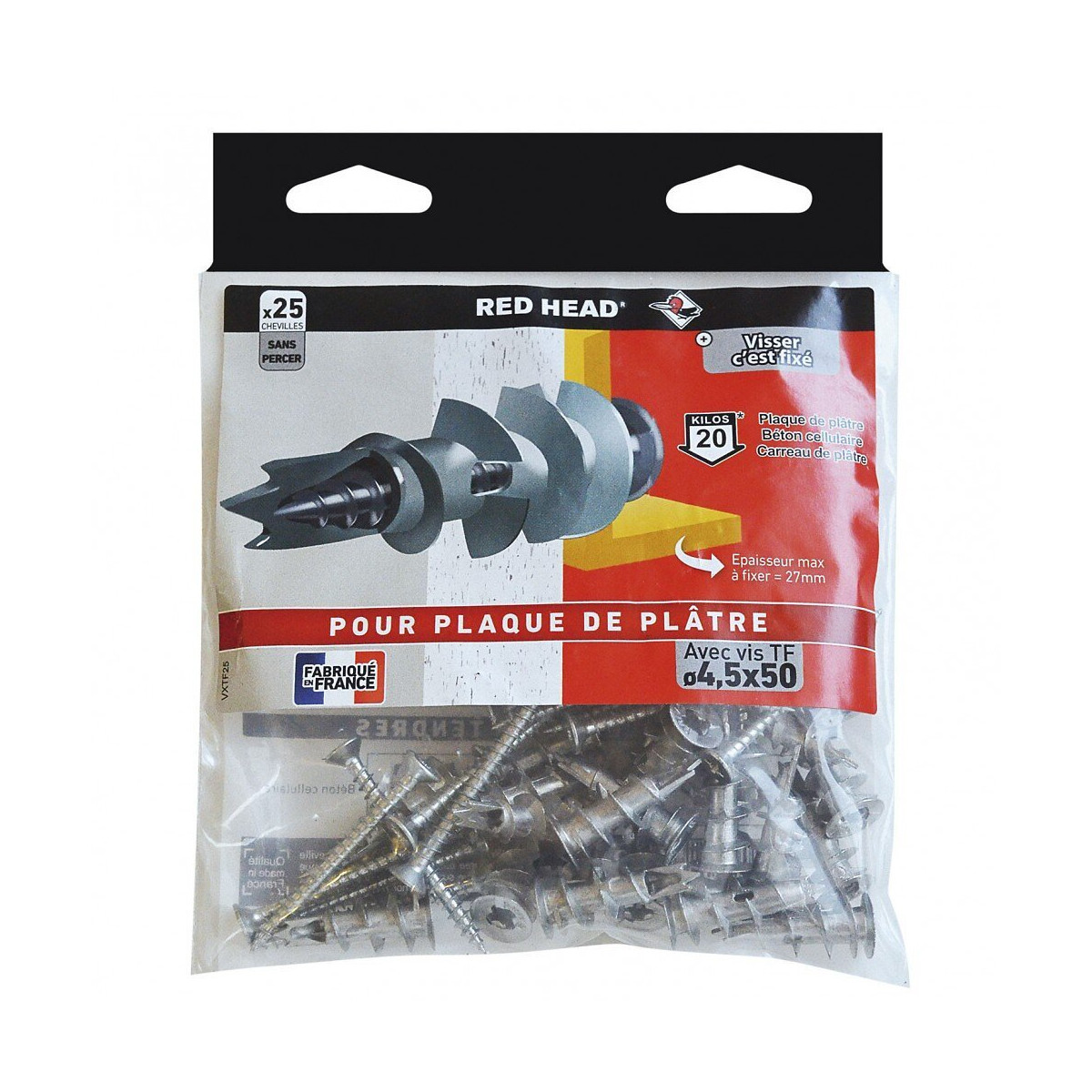 Pas de perçage préalable (la cheville en forme de pointe fore la plaque de platre), blocage en fin de vissage Plus Produit: Pas de perçage préalable (la cheville en forme de pointe fore la plaque de platre), blocage en fin de vissage Composition du kit: 25 chevilles vix, vis tête fraisée 4.5x50mm Poids indicatif supporté matériau creux (en kg): 20 Perçage préalable: Non Type d'outil à utiliser: Tournevis ou visseuse Cheville réutilisable: Non Possibilité de retirer la cheville: Oui Diamètre de la cheville (en mm): 12 Longueur de la cheville (en mm): 30 Indication du geste de tri (triman): Nos produits et emballages peuvent faire l'objet d'une consigne de tri. Pour en savoir plus : www.quefairedemesdechets.frSpécifications techniques