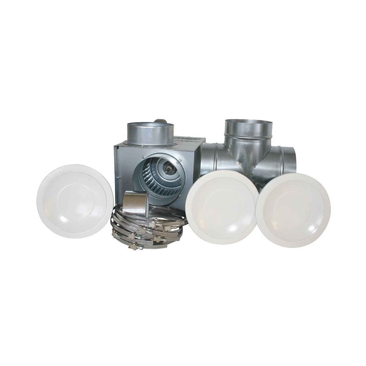 Kit de Récupération d'Air chaud 3 pièces - Composition : 1 moteur 350m³/h + 3 bouches d'insufflation réglables diamètre 125mm avec manchettes + 1 croix diamètre 125mm + 1 ruban alu 10 mètres + 9 colliers de serrage