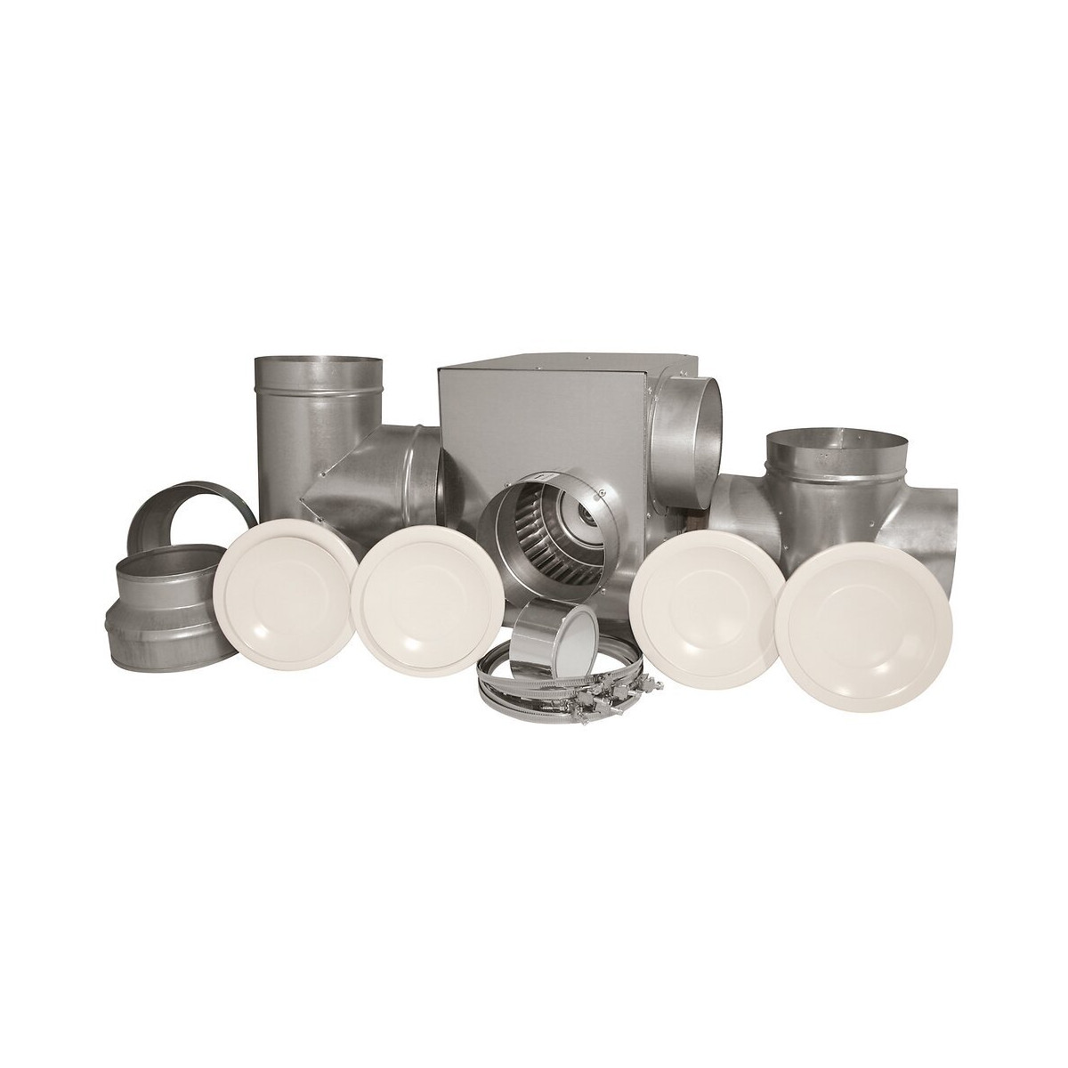 Kit de Récupération d'Air chaud 4/6 pièces, 1 moteur 500m³/h + 4 bouches d'insufflation directionnelles réglables diamètre 125mm + 1 croix diamètre 160/125mm + 1 té diamètre 160mm + 2 réductions diamètre 160/125mm + 1 ruban alu 10 mètres + 13 colliers de serrage.