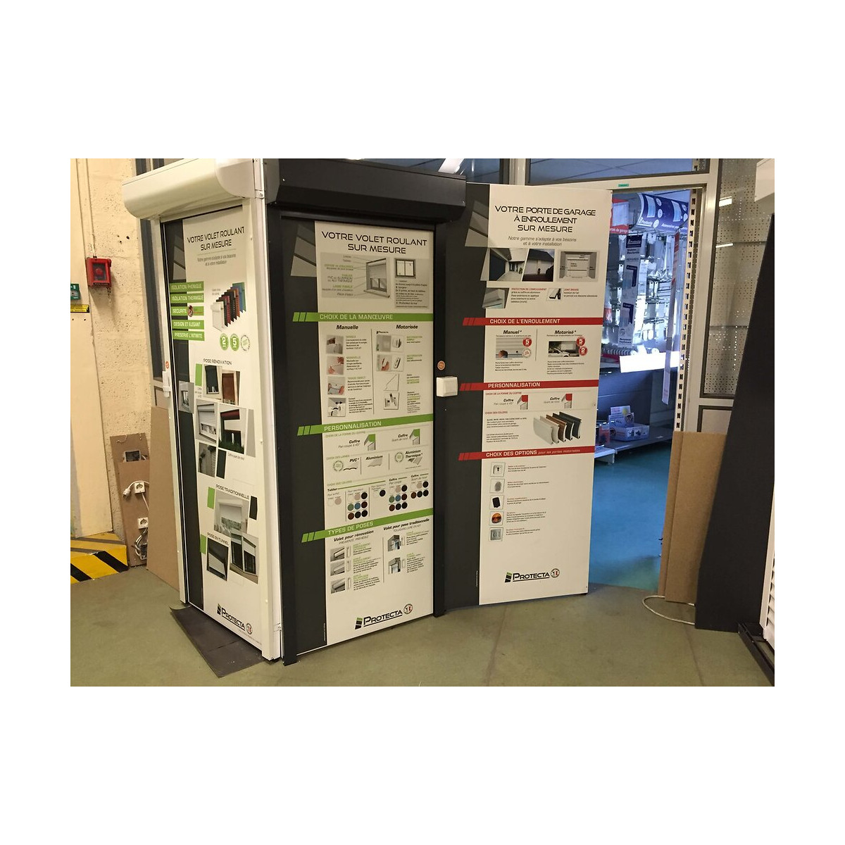 Présentoir de volets et portes de garage sur-mesure 3 faces.