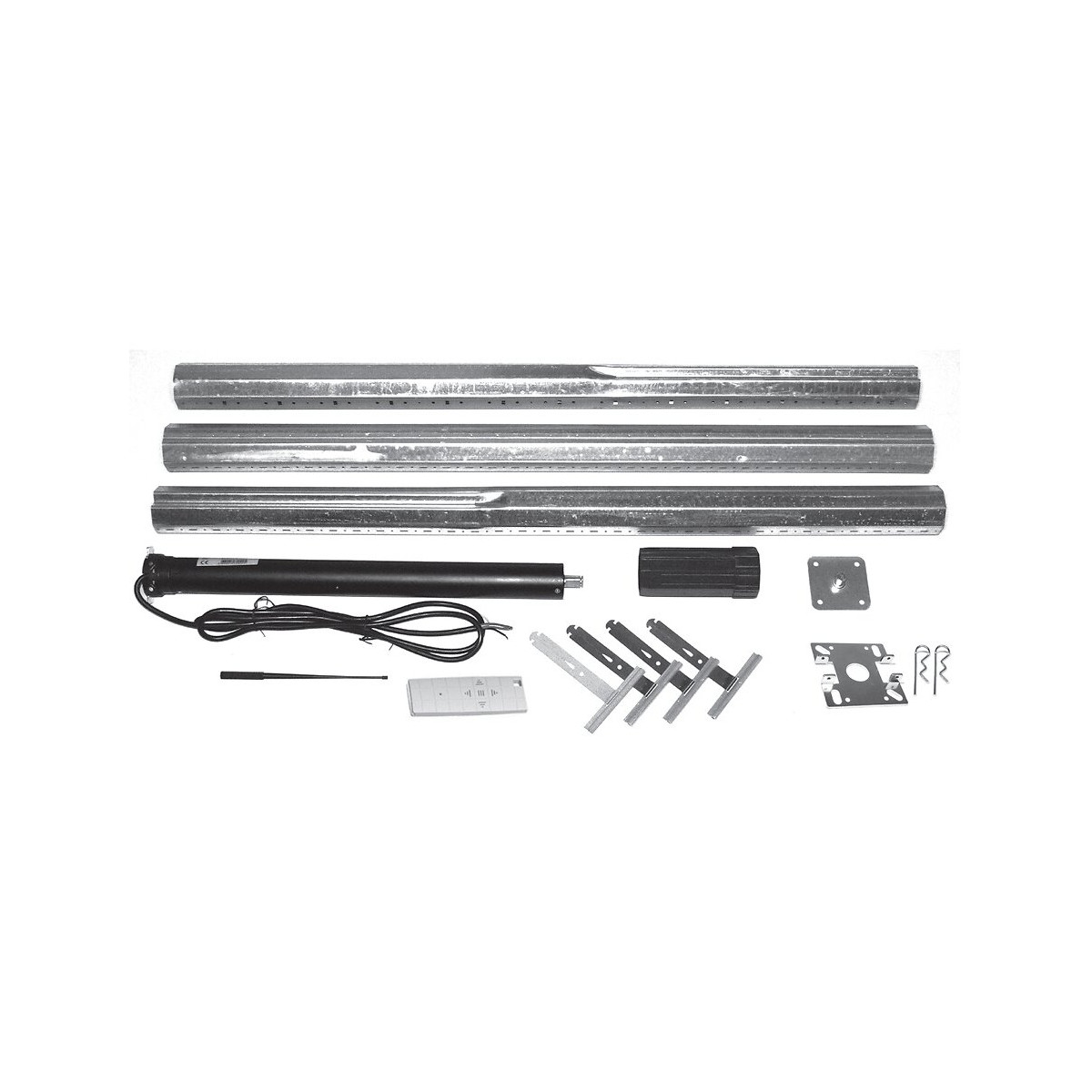 Le kit complet pour motoriser un volet roulant comprend un moteur à commande radio (30 N.m) avec tige de réglage, un tube télescopique en 3 parties ajustable jusqu'à 2,50m, une roue avec couronne, un kit de support, un embout rétractile octogonal de 60 mm et roulement à billes, 4 attaches lames et une télécommande.