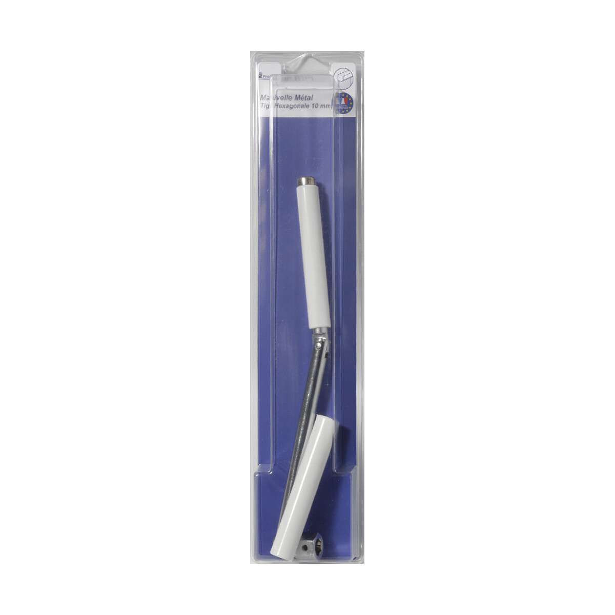 Manivelle métal chromé pour tringle hexagonale de 10 mm, tige non fournie, vis de fixation et poignée incluses.