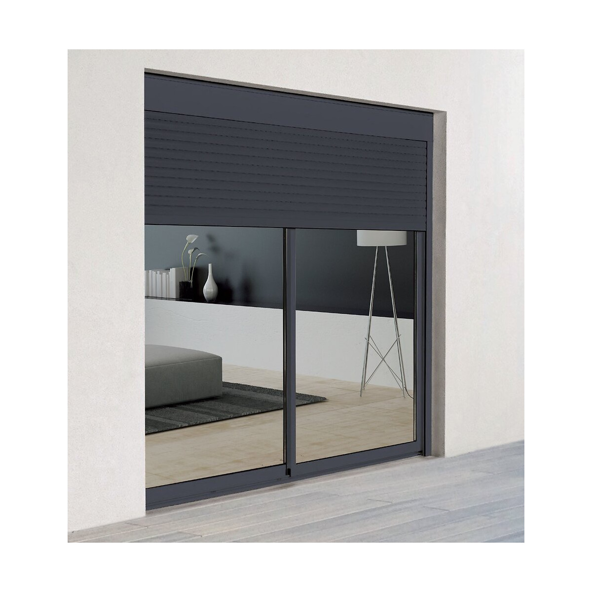 Volet roulant adaptable à motorisation filaire, tablier en aluminium gris, lames ajourées, avec coffre et coulisses en aluminium, recoupable en hauteur et largeur, livré avec l'interrupteur. Dimensions : h.2150 x l.2400 mm.