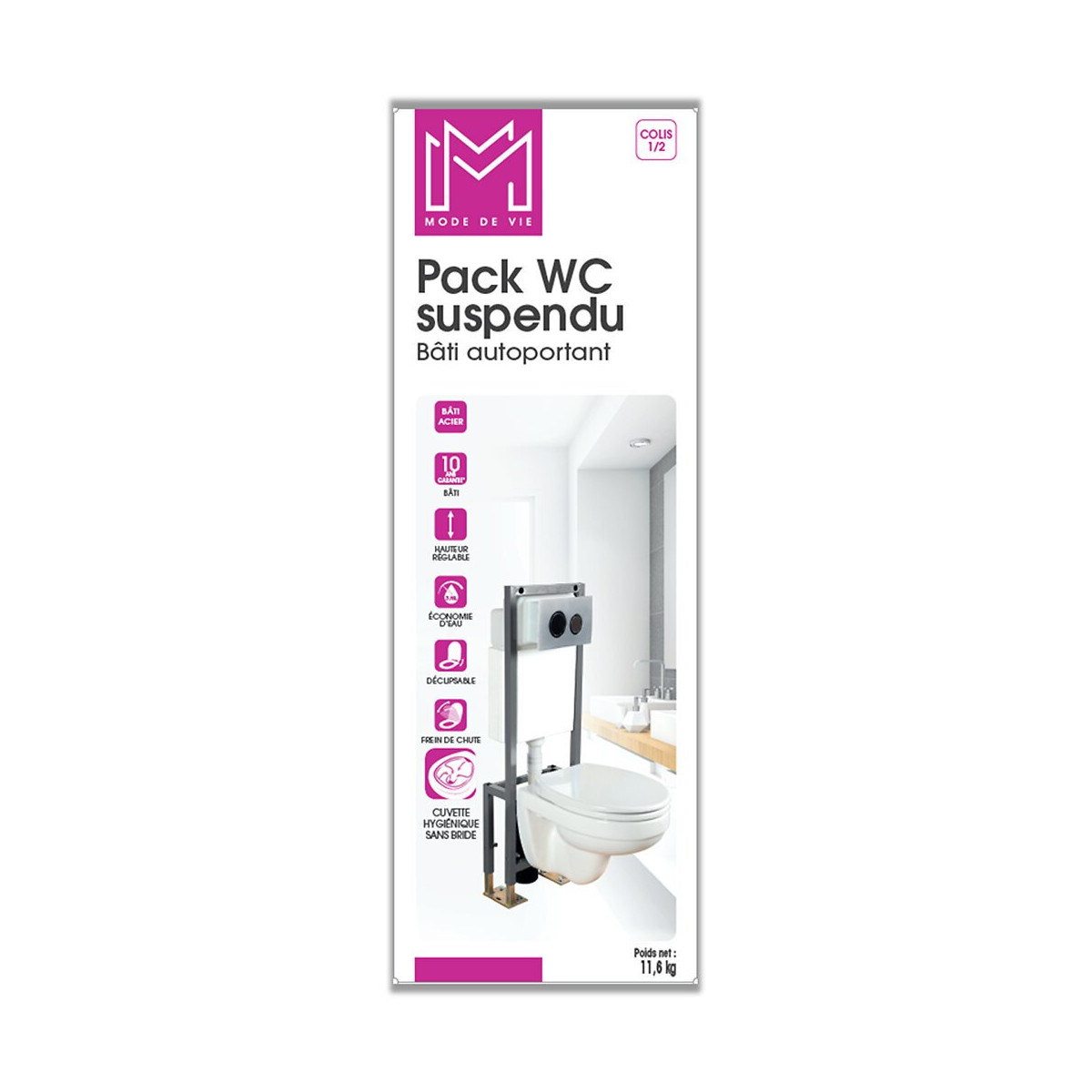 Bâti-support en acier - Mécanisme à bouton poussoir 3/6 L. - Plaque de commande en ABS finition chrome satiné. - Accès au mécanisme par plaque de commande. - Fixation uniquement au sol (6 points). Le sol doit être en béton afin d’assurer une bonne stabilité et une fixation robuste. - Livré avec pipe de sortie verticale et vanne d’arrêt 1/2 tour. - Hauteur réglable. - Cuvette en céramique blanche sans bride, semi-carénée pour une hygiène parfaite et un entretien aisé - Abattant thermodur avec frein de chute et déclipsable, garanti 2 ans. Dimensions du colis bâti : L.109,5 x l.37 x H.24 cm - 18,75 kg. Dimensions du colis cuvette : L. 40 x l.44 x H.55 cm - 25 kg.