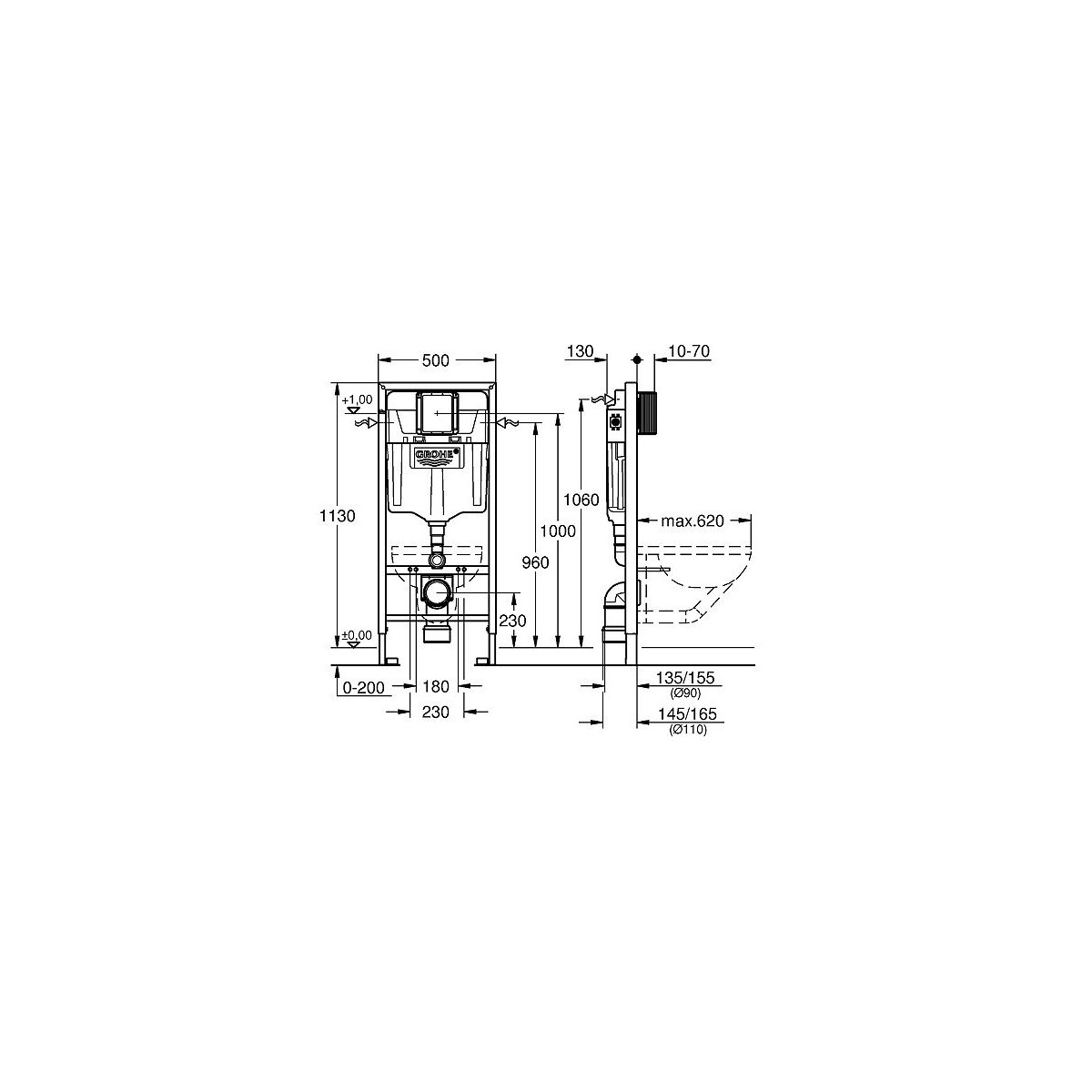 Caractéristiques du bati support rapid SL Grohe avec plaque de commande Grohe Skate Air Ce lot comprend Bati support Grohe Rapid SL (Ref : 38528001) Plaque de commande Skate Air chromée (Ref : 38505000) ou blanche (Ref : 38505SH0) au choix Manchon de raccordement WC (Ref : 359.144.11.1) Bati support Rapid SL Hauteur: 1,13m Avec réservoir GD 2 Pour mur porteur Châssis en acier finition époxy Pour cloison creuse, complètement pré-monté Avec réglage rapide et verrouillage de la hauteur jusqu’à 200 mm Livré avec matériel de fixation Homologué TÜV Livré avec tiges et écrous pour fixation de la cuvette WC fixation céramique Les WC céramique avec petite surface de portée (< 205 mm) nécessitent un accessoire additionnel 38 779 000 Ecartement des fixations 180/230 mm Coude d’évacuation Réglable en profondeur et en hauteur (200 mm) Réduction Ø 90/110 mm Garniture d évacuation et d alimentation Plaque de recouvrement, connection GD-2 réservoir 6 - 9 litre Réglage d’usine 3 et 6l Mécanisme à déclenchement pneumatique (AV1) pour plaque de commande simple touche (interrompable) et double touche (interrompable) Alimentation latérale ou par l’arrière Classe silence I DIN 41 09 Réservoir isolé contre la condensation Alimentation d eau avec robinet d équerre et raccordement flexible, connection rapide sans outil trappe de visite: - à monter sans outils - fermé pendant phase de construction Montage horizontal ou vertical plaque de recouvrement, connection Equerres murales 38 558 00M (vendu séparément) pour le montage des plus petites plaques de commande optionnelles, commandez séparément la trappe de visite 40 911 000 Ref produit : 38528001 Plaque de commande Skate Air Double touche interrompable Pour mécanisme pneumatique AV1 Montage vertical 156 x 197 mm En ABS GROHE StarLight Chrome éclatant et durable GROHE EcoJoy économie d’eau Au choix chromée (ref produit : 38505000) ou blanche (ref produit : 38505SH0) Manchon de raccordement WC Pour cuvette suspendue. PVC avec joint torique Pour PEHD Ø 90 mm à emboîter et PVC Ø 93,6 x 100 mm à coller Ref produit : 359.144.11.1